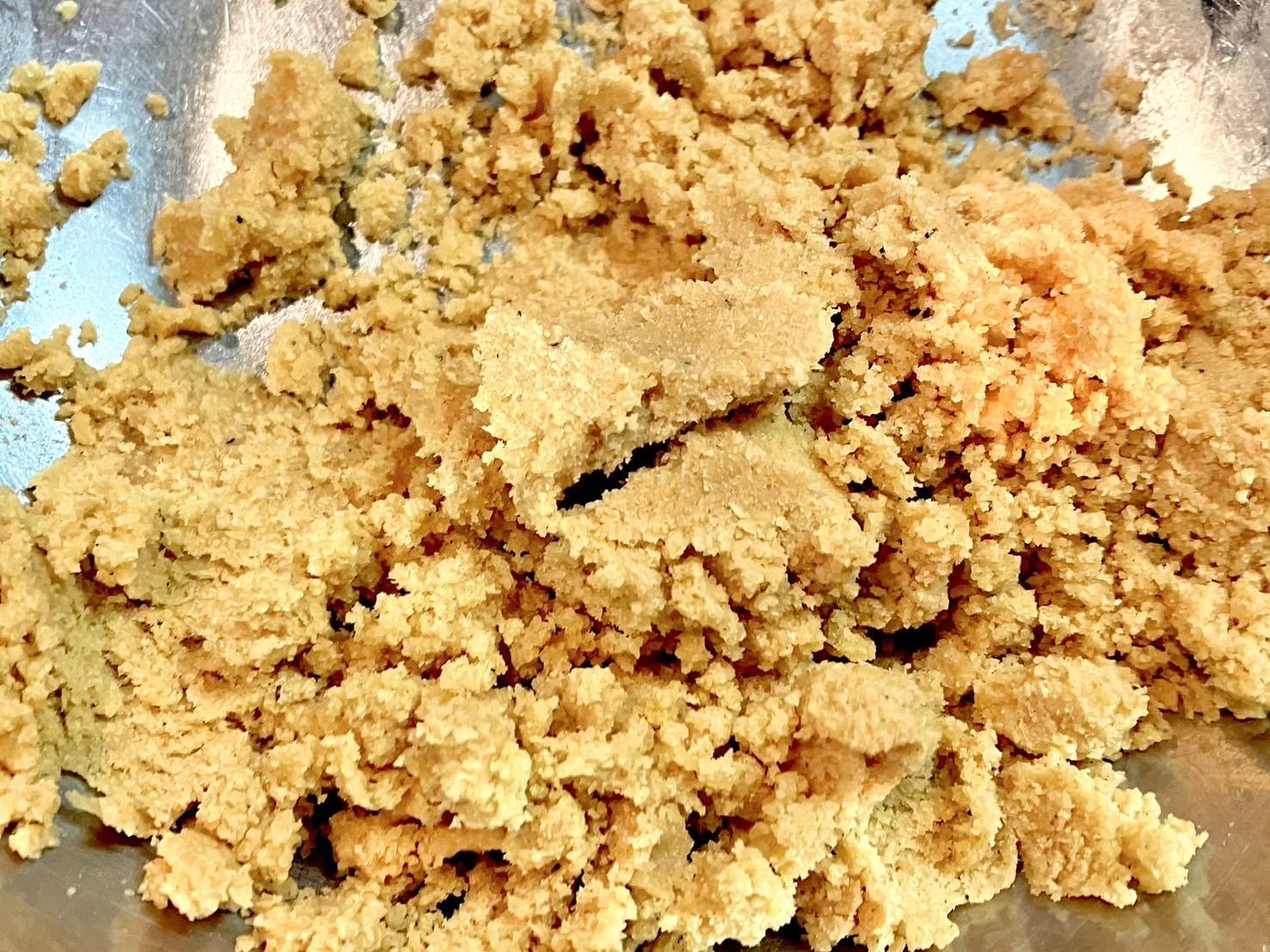 普段クッキーを作る時に使う小麦粉の中には「グルテン」という ねばりのあるたんぱく質が入っているので、捏ね続けると次第にまとまっていく。