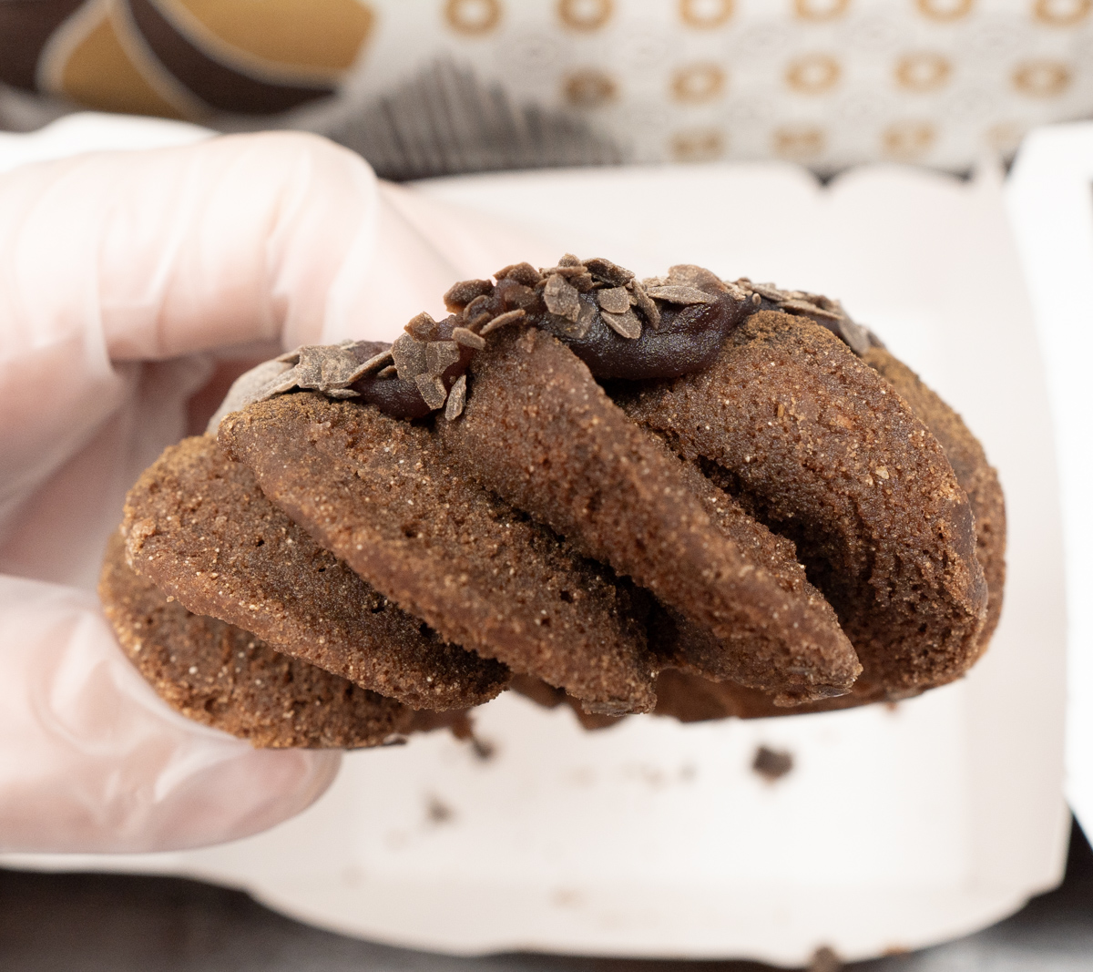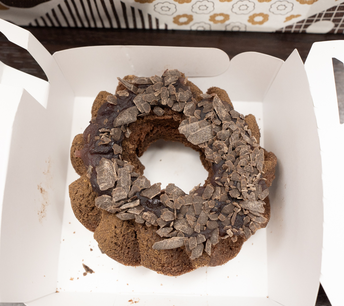 トッピングのチョコとあんこはどちらも甘いが、しかし異なる方向性の甘さが楽しませてくれる。また、ソフトなあんこと硬質なチョコによる食感面での共演も、このドーナツの総合的なクオリティを引き上げることに、大いに貢献している。
