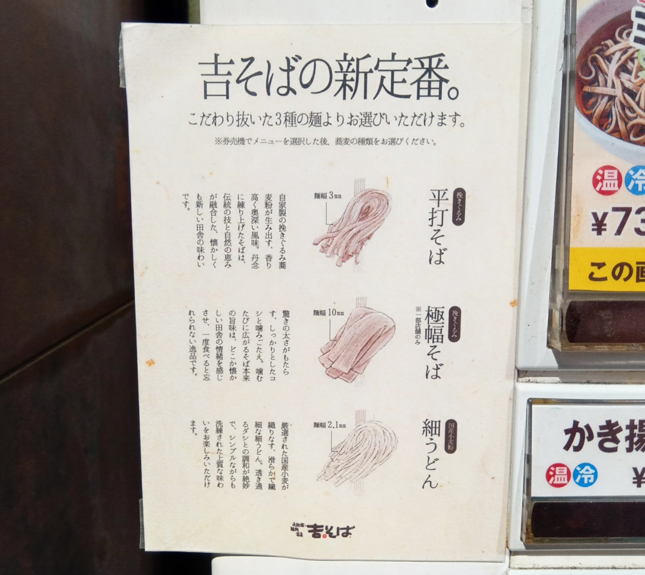 立ち食いそば屋の『吉そば』は実は音楽スタジオのNOAHが運営している。バンドマンである私(中澤)としては、立ち食いそば屋の中でも異彩を放つそば屋だ。吉そばがあると「おっ!」と思う。