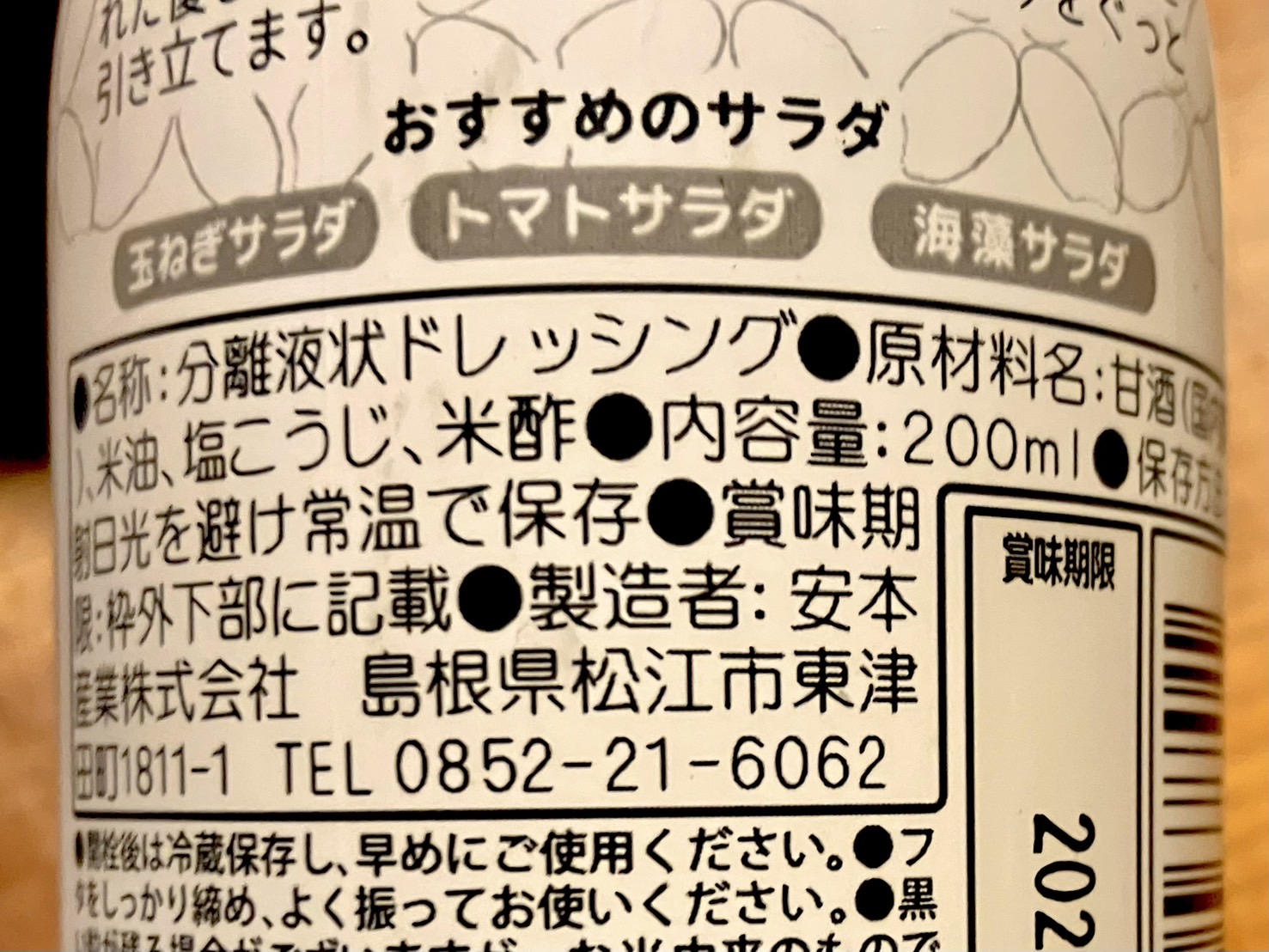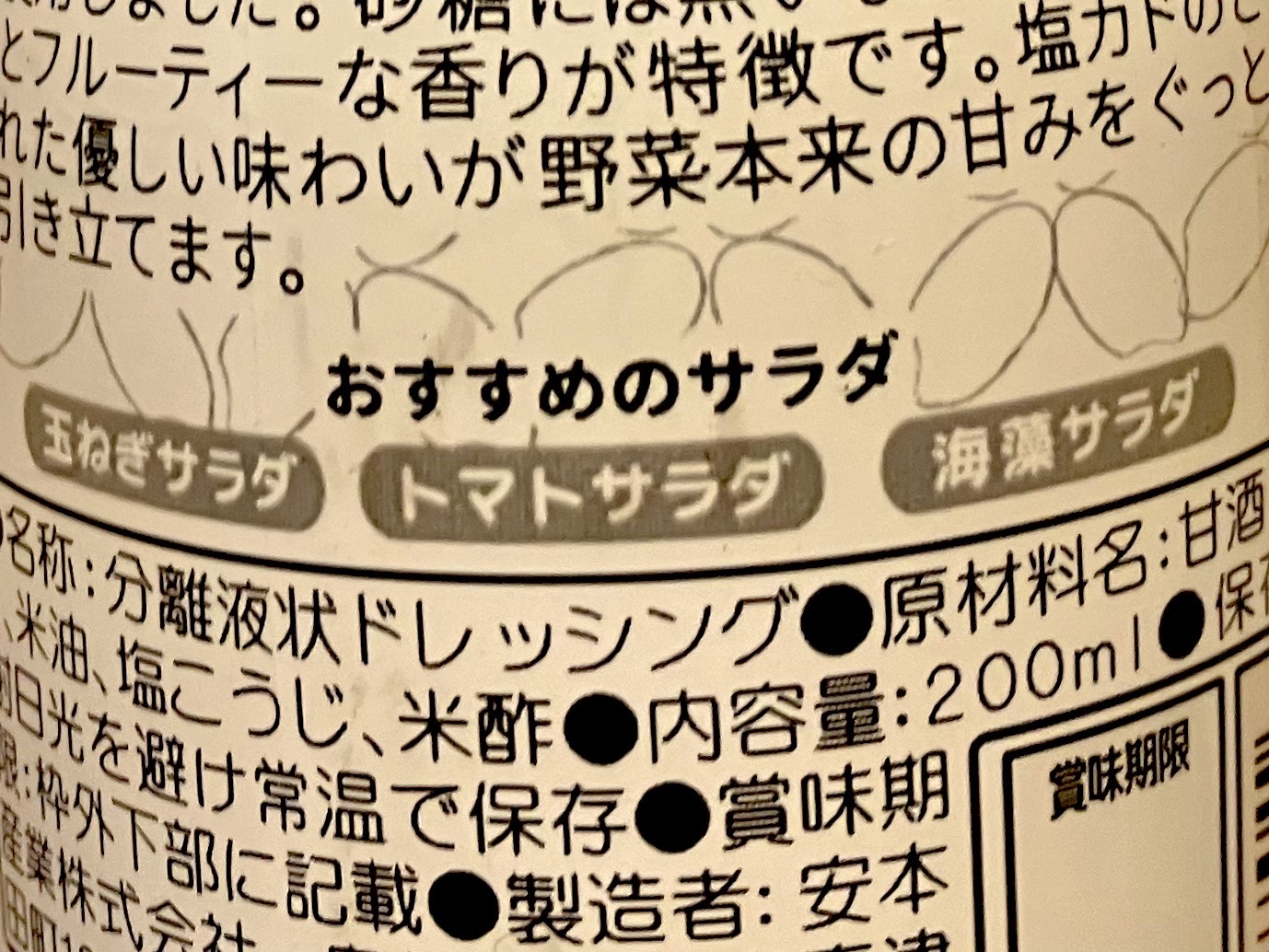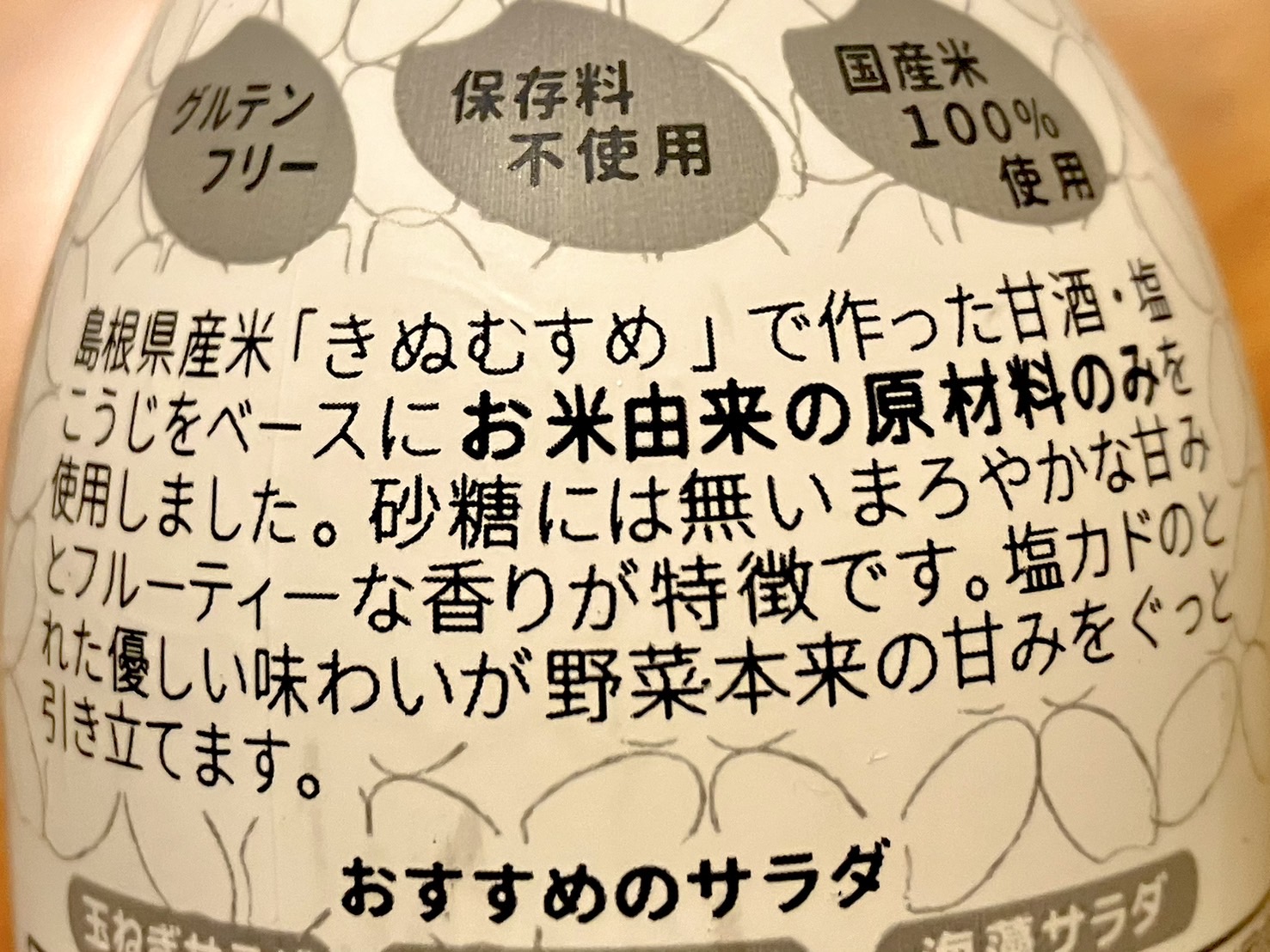 ラベルの裏面に書かれていた説明文によると、このドレッシングは甘酒や塩こうじ、米油などのお米由来の原材料のみを使用して作られているそうだ。