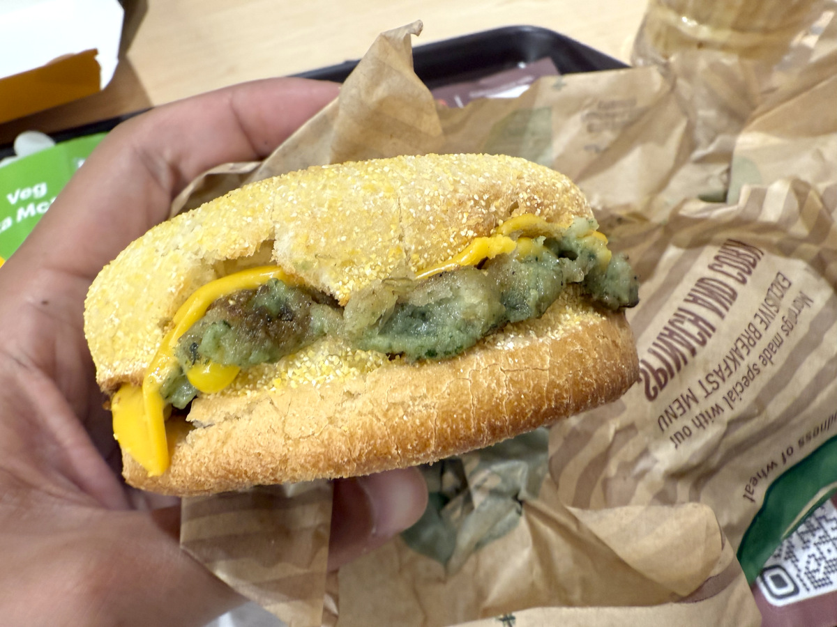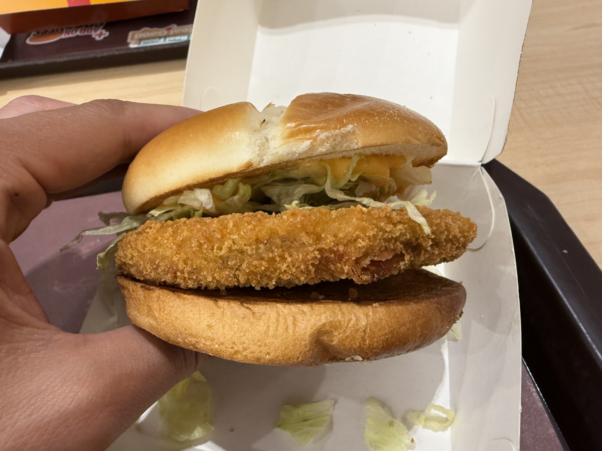 で、まずは日本の「ハンバーガー」や「チーズバーガー」に相当すると思われる「クリスプベジマック」は、要するにコロッケバーガーといった感じ。やや辛いソースと相まって意外とガツガツ食べられる。