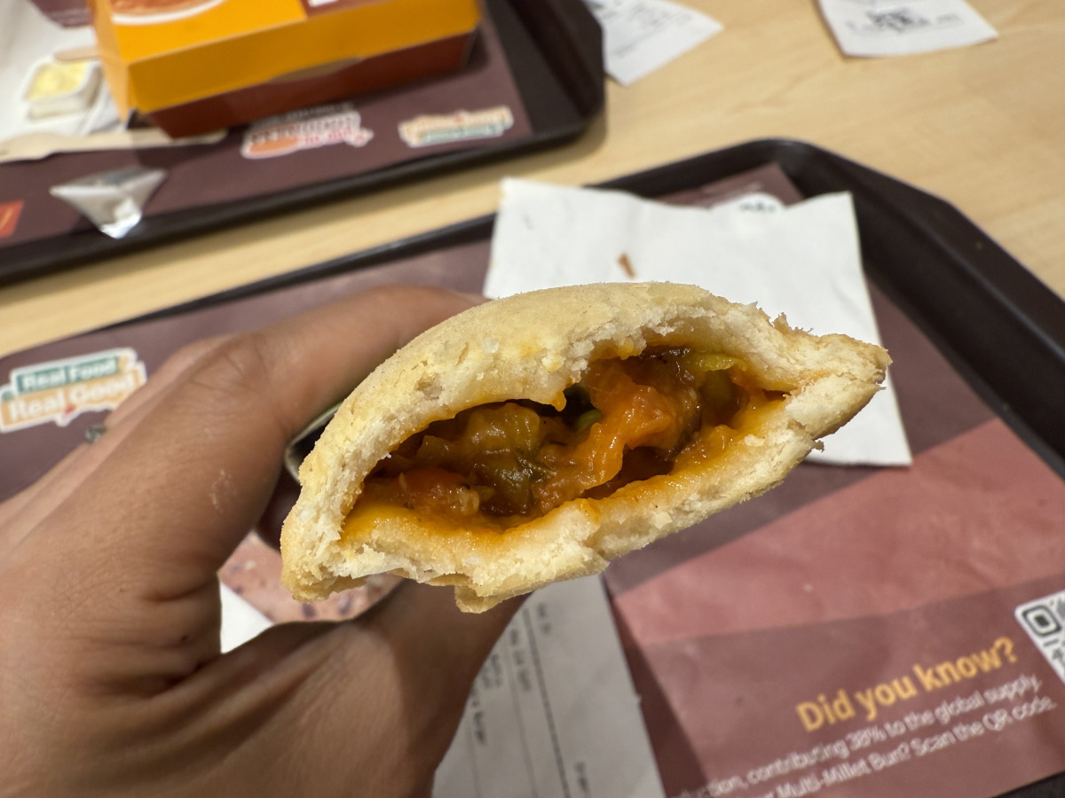 そしてラストの「ピザパフ」はアップルパイと同じ形状で、どうやら揚げずにベイクドされている様子。味はトマトソースで、誰が食べても食べやすいと感じるであろう、万人受けする味であった。