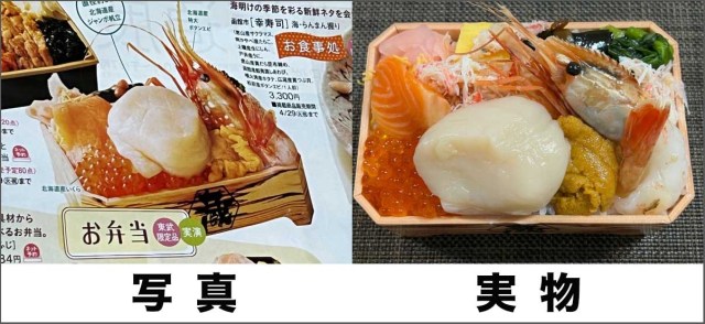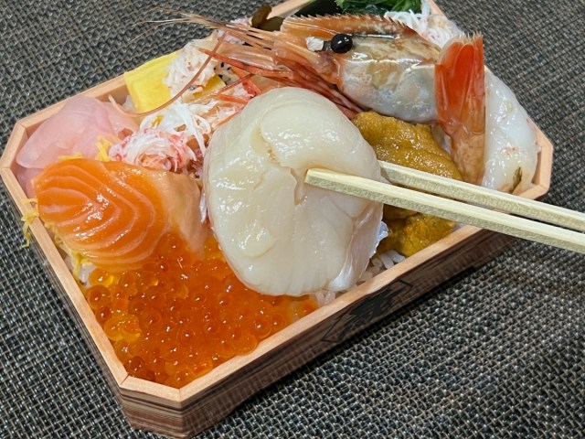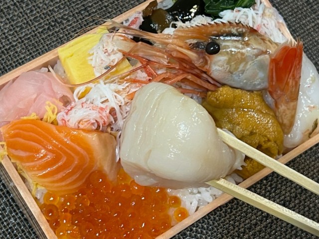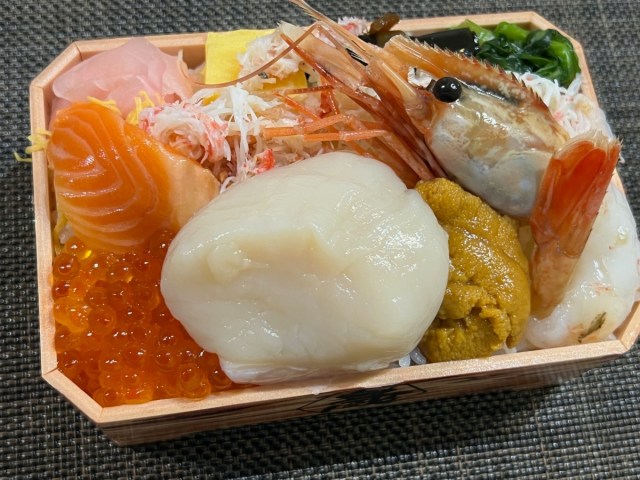 そのお弁当はエビやらウニやらが乗っているのだが、ホタテがあまりにもデカすぎるのだ。まるで、写真の加工をミスったのかと思うほどに。
