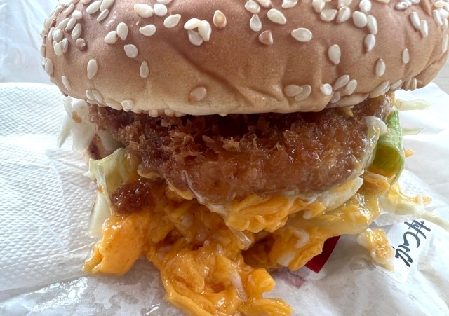 ハンバーガーの包装紙なのに、「カツ丼」と書かれているのがシュールだ。包装紙を開けて、いよいよ対面。