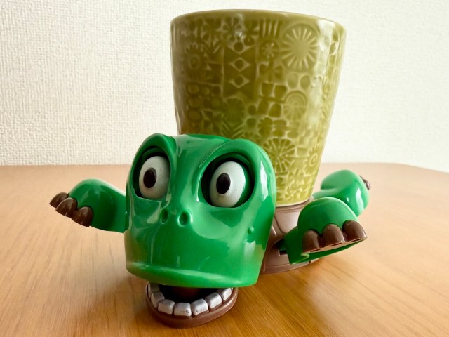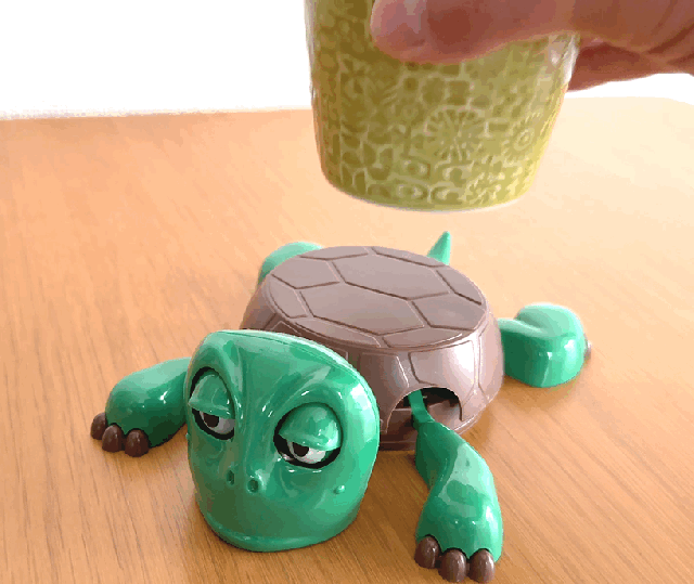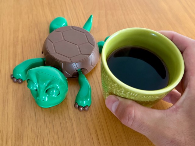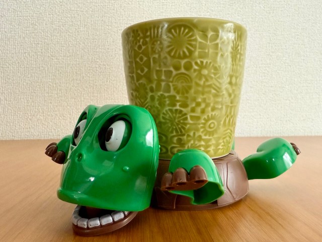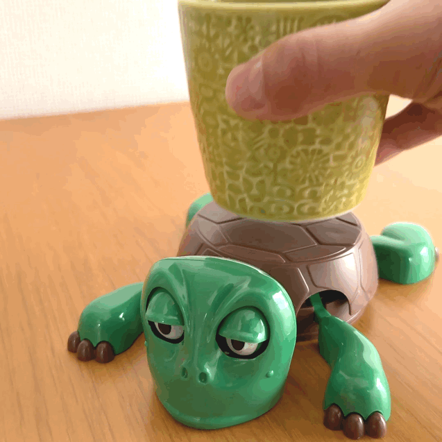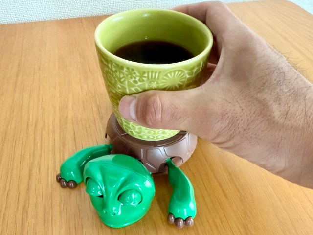 言うまでもなく、亀の甲羅にドリンクを置くだけ。商品ページ曰く「滑り止めの効果がある」とのこと……いや、かなりツルツルというかプラスチック製なのでむしろ滑りやすいだろう。油断したらヤケドしてしまう。ナメない方がいい。