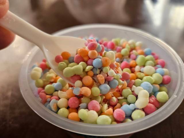 まずは「レインボー」からいただこう。小学生以来、約20数年振りのディッピンドッツの味は果たして……。