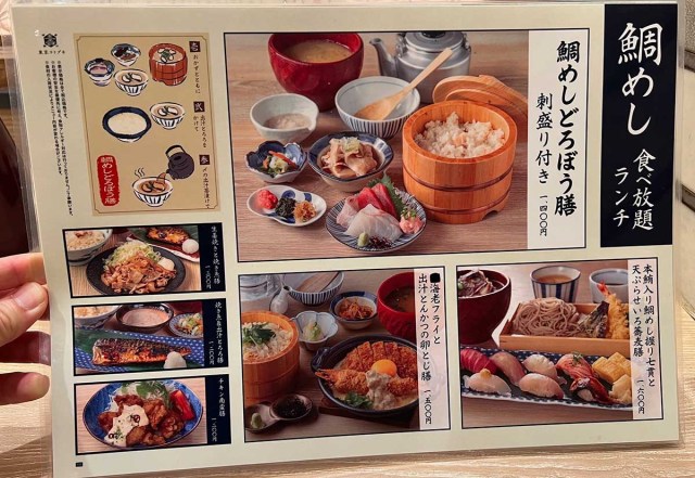 「鯛めしどろぼう膳 刺盛り付き」が1400円で、「海老フライと出汁とんかつの卵とじ膳」が1500円で、「生姜焼きと焼き魚膳」が1300円……。繰り返すが、どれも鯛めし食べ放題である。
