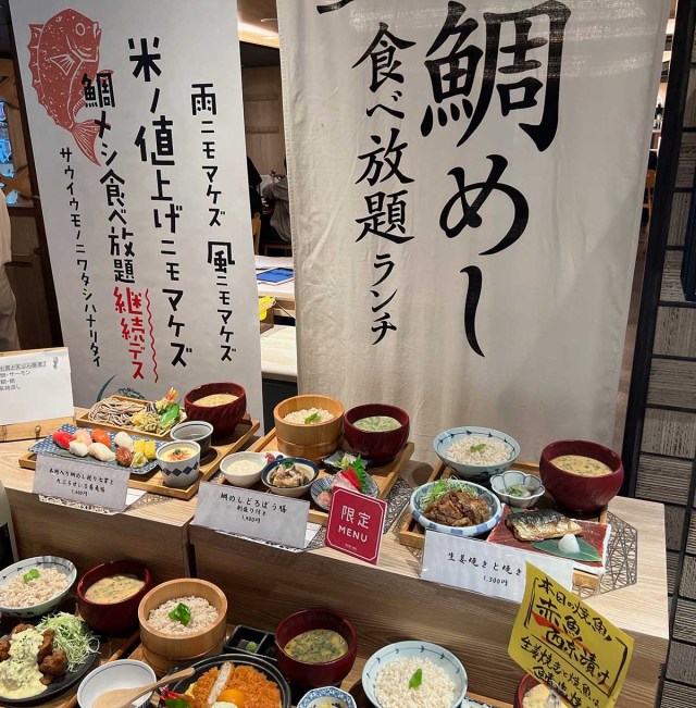 お店に行ってみると、「米ノ値上げニモマケズ 鯛メシ食べ放題継続デス」の言葉が目についた。