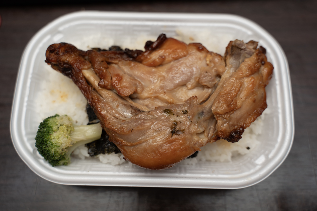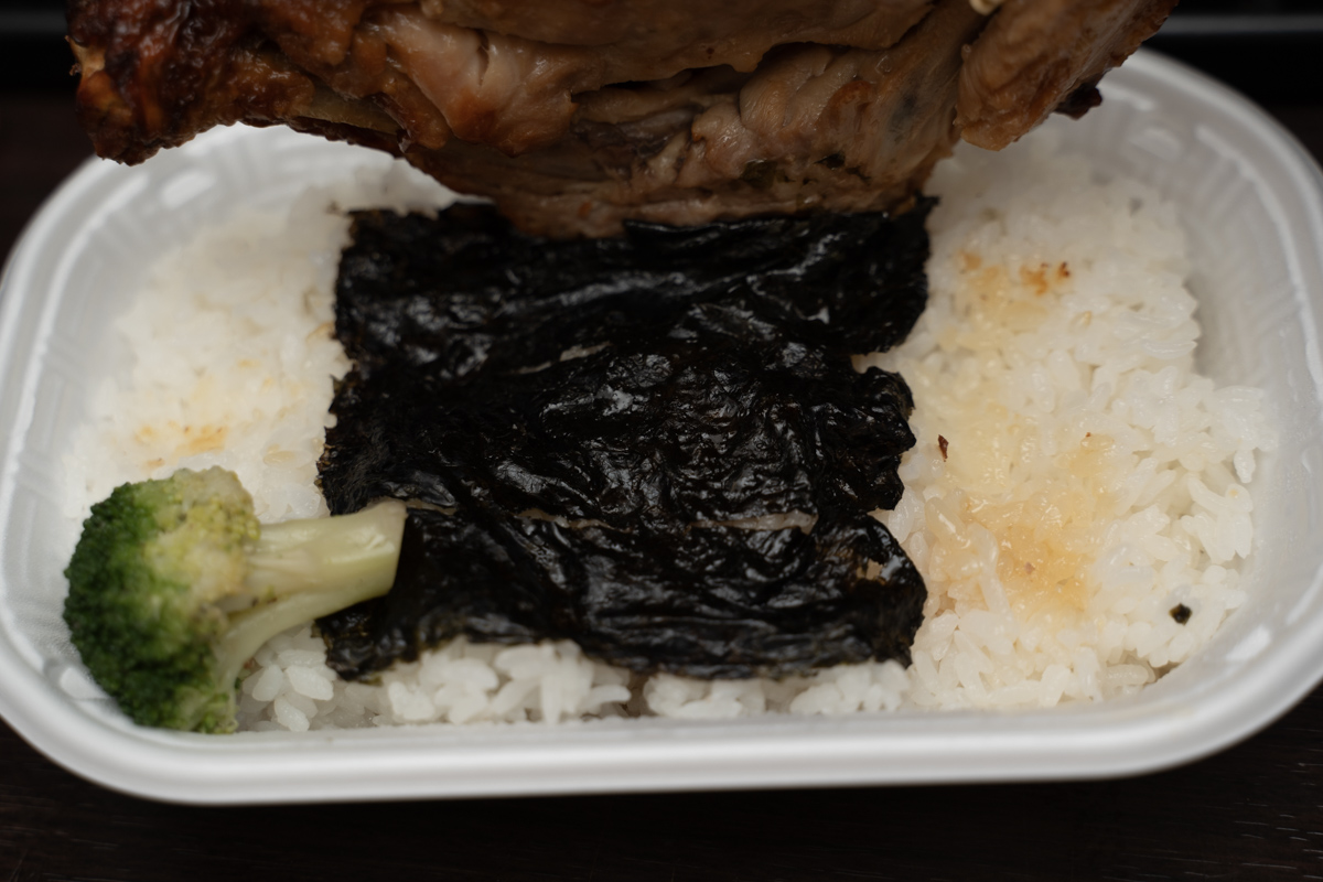しかし、海苔の上に乗ったのがシャケやタラなどではなく、チキン。しかも骨付きで、クリスマスとかでしか見ないタイプのチキンだ。