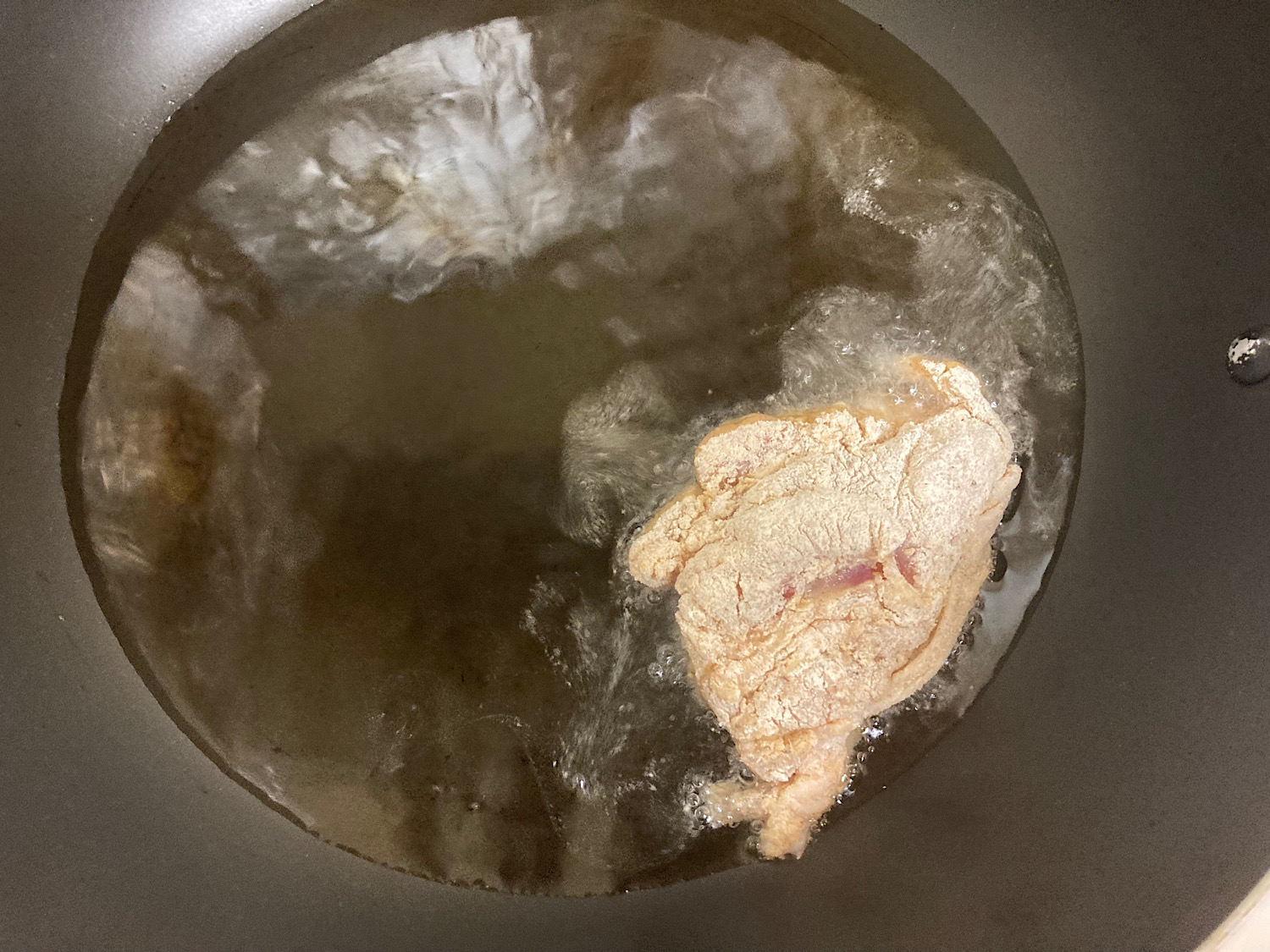 180℃の油……らしいのだが、油の温度なぞよう分からんので中火くらい。ケチって1.5cmくらいの油で揚げてみた。