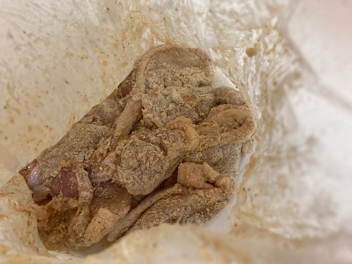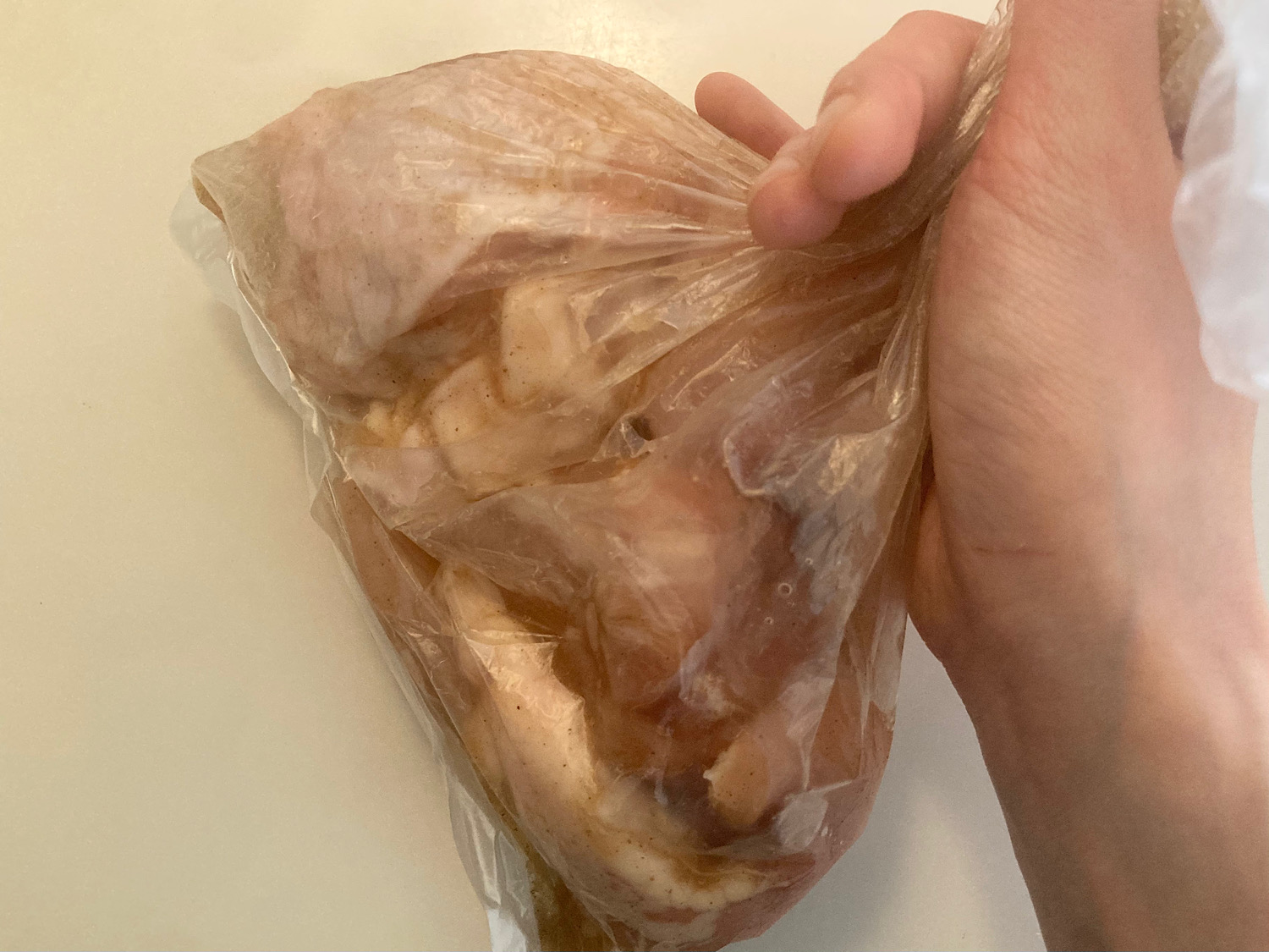 ポリ袋で「下味たれ」を揉み込んで一旦放置。30分以上とのことだったが、なんだかんだで半日くらい放ったらかしてしまった。