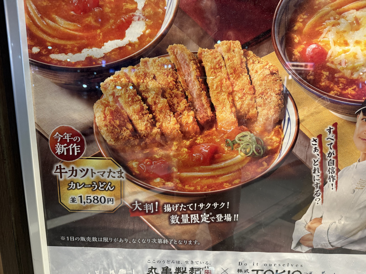 2025年4月、そんな1人前1580円のうどんが我らが丸亀製麺から数量限定で発売されている。ここで結論を申し上げてしまおう、個人的に1580円の『牛カツトマたまカレーうどん』はそこまでオススメできない。というのも……。