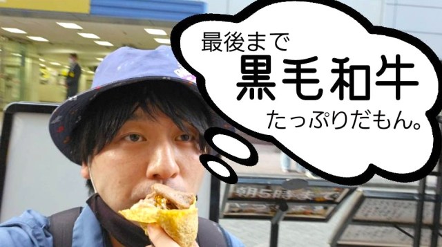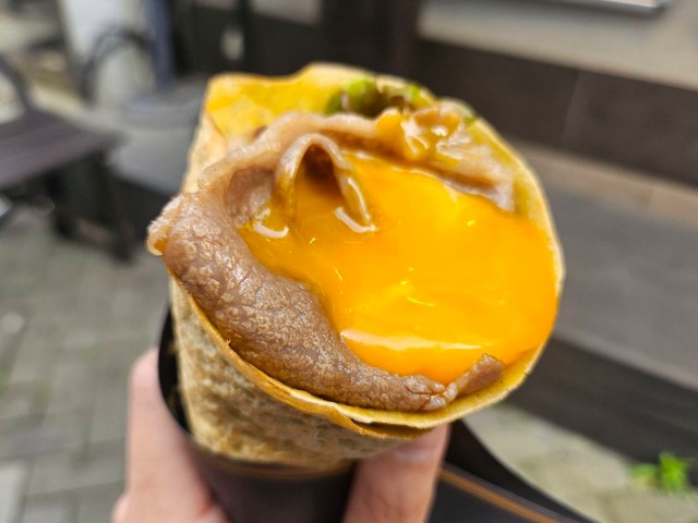 分厚い黒毛和牛がクレープの中にギッシリつまっていた。まだ食べてない下のほうを確認してみても、マジで先っちょまでギッシリ。