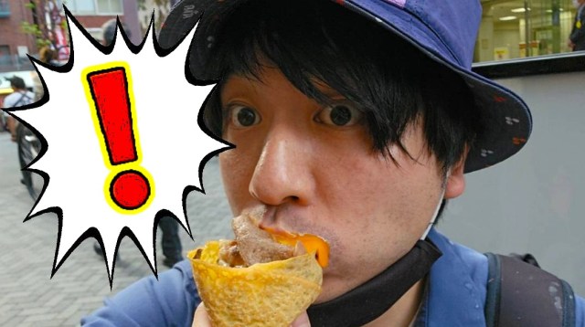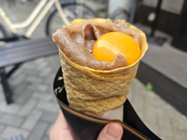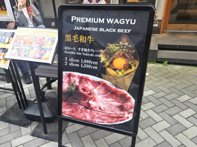 先日も、浅草で『黒毛和牛 すき焼きクレープ』なる商品を発見。正直、インバウンド向けのなんちゃって黒毛和牛グルメだろう……なんてことを感じつつも、看板の画像に惹かれたので購入してみることにした。