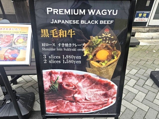 先日も、浅草で『黒毛和牛 すき焼きクレープ』なる商品を発見。正直、インバウンド向けのなんちゃって黒毛和牛グルメだろう……なんてことを感じつつも、看板の画像に惹かれたので購入してみることにした。