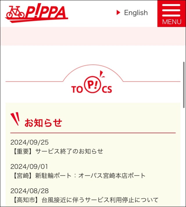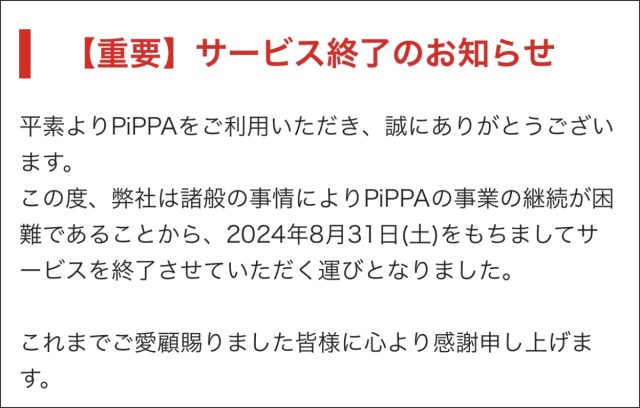 いやいや、おかしいって! 「PiPPA」ってサイトに今もバリバリ表示されてますやん!! 不信に思いトップページに戻ってみたところ、私はそこでさらなる衝撃の文字を目にする。