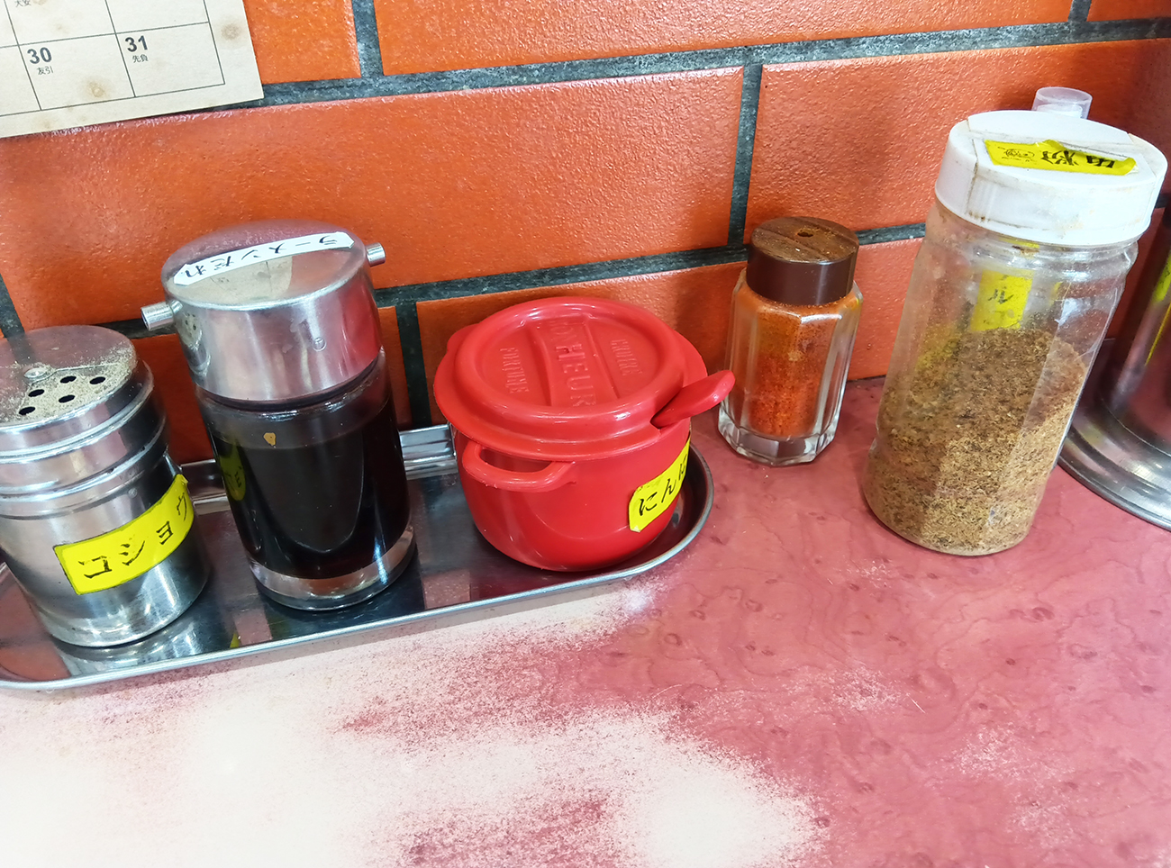 「お好みで魚粉をかけてください」とのことなので、卓上の調味料を見たところ、確かに鰹節粉みたいな粉がある。また、その他にも、にんにく、コショウ、ラーメンだれ、香辛料があった。まずは、何もかけずに食べてみたところ……