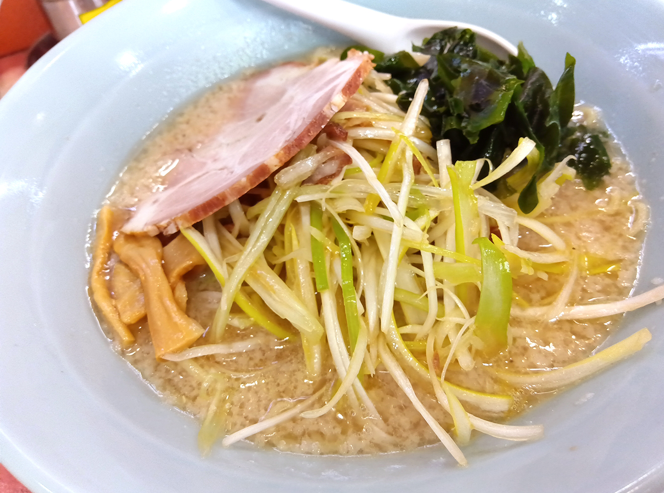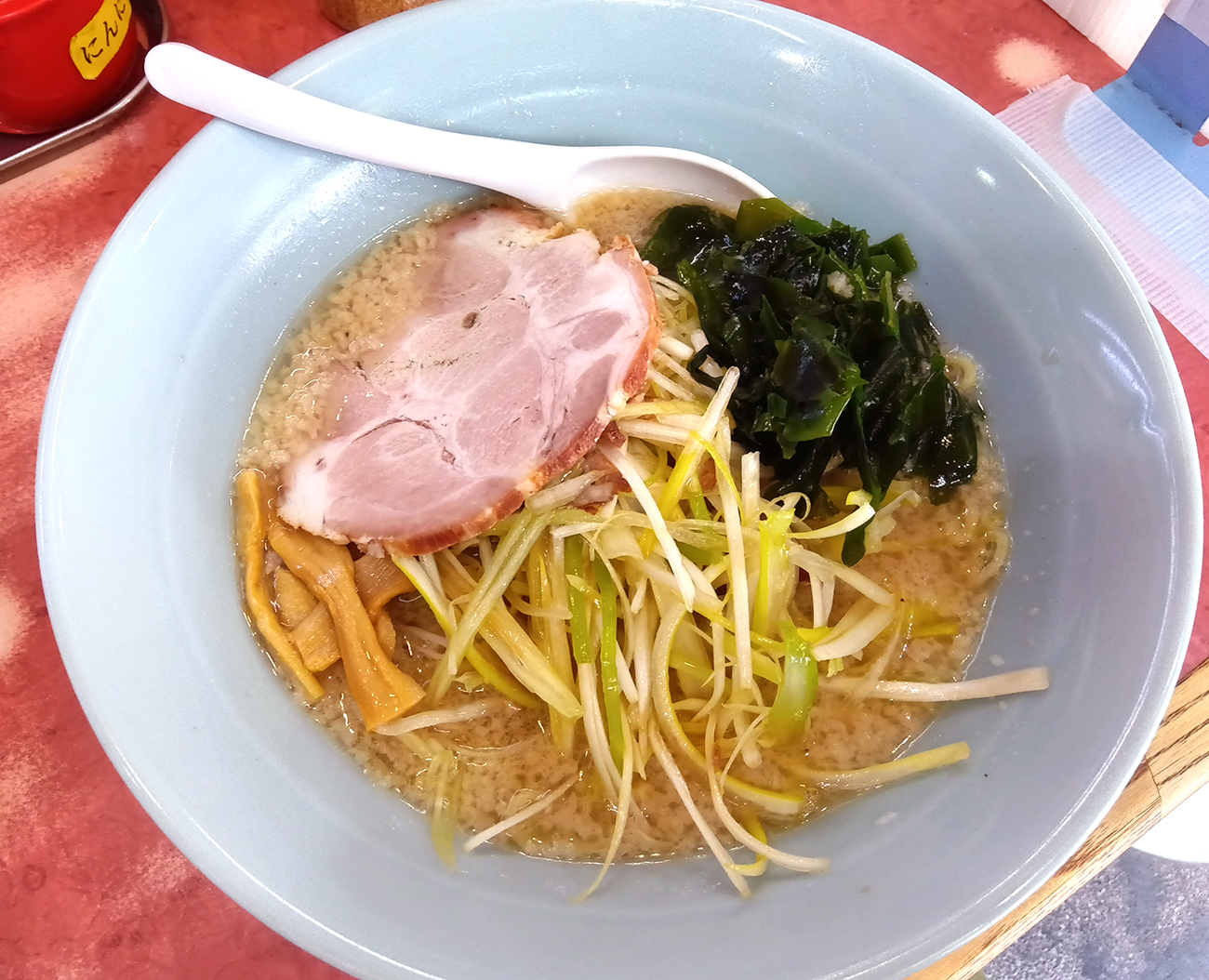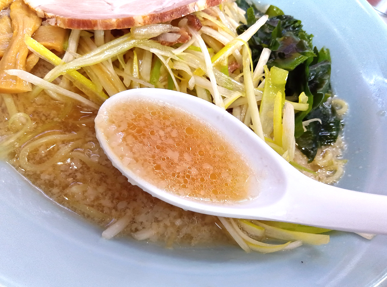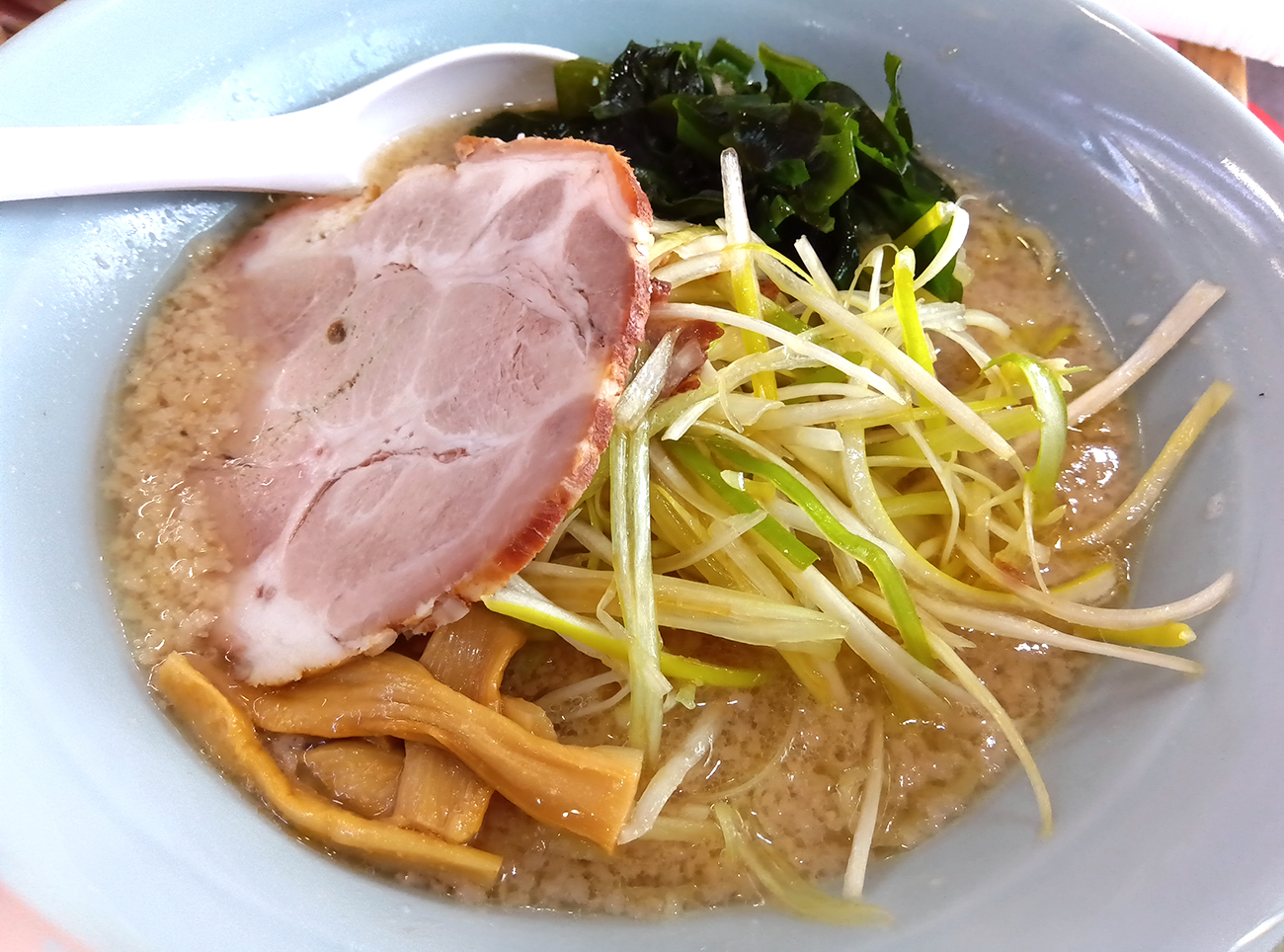 ネギが背脂の海にダイブしていた。それゆえか、香りも豚のクセが凄い。知ってるラーショのネギラーメンと全然違う! こんなに背脂全開のラーメンショップがあったとは。