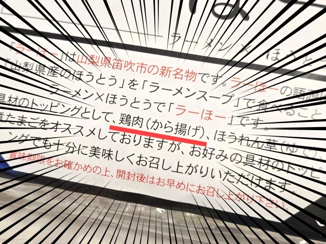スープの素と麺のみの構成なので、具材は自分で準備する必要がある。ラーメンの具材かほうとうの具材か、どちらが適切なのかわからないので、推奨されている具材を見てみると⋯⋯