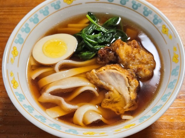 推奨トッピングのからあげ、ゆでホウレン草、煮卵を乗せて完成! ビジュアルはラーメンだけど、よく見ると麺が太いな。