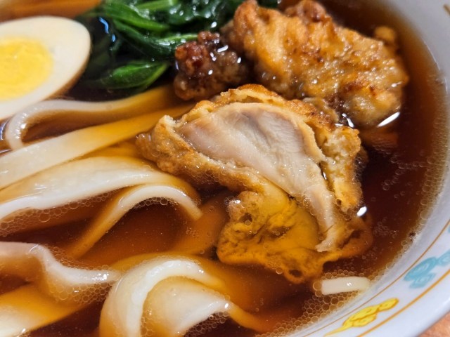 トッピングにからあげは意外すぎたけど、食べてみると意外と良い感じ。スープ自体がそこまで複雑な味では無いので、あっさりチャーシューよりも脂が溶けだす唐揚げの方がたしかに合っている気がする。スープが染みたひたひたからあげは背徳の味わいだ。
