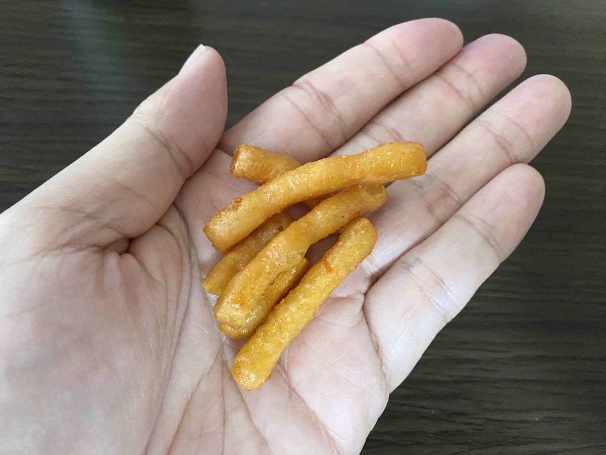 ガツガツというよりは気づいたら手が止まらなくなっている “沼” タイプだった「めんたい味かりんとう」。博多駅だけじゃなく空港でも売られていたので、売れまくっていない限りは手に入りやすいと思われる。