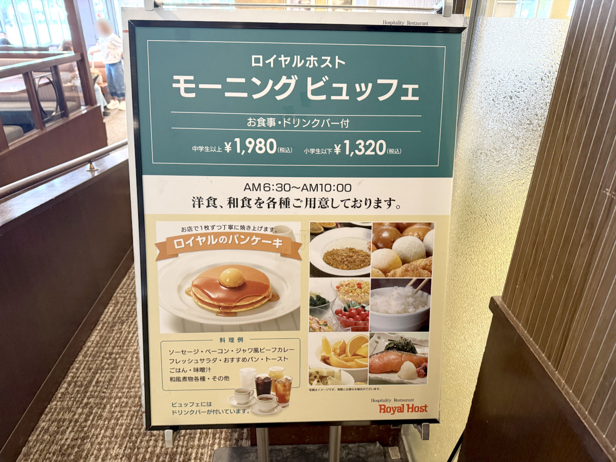 その例に漏れず、ロイヤルホスト八丁堀店は「ホテルサードニクス東京」の1階に店舗を構えている。つまり宿泊客の朝食ビュッフェが「ロイヤルホスト八丁堀店」で開催されているワケだ。