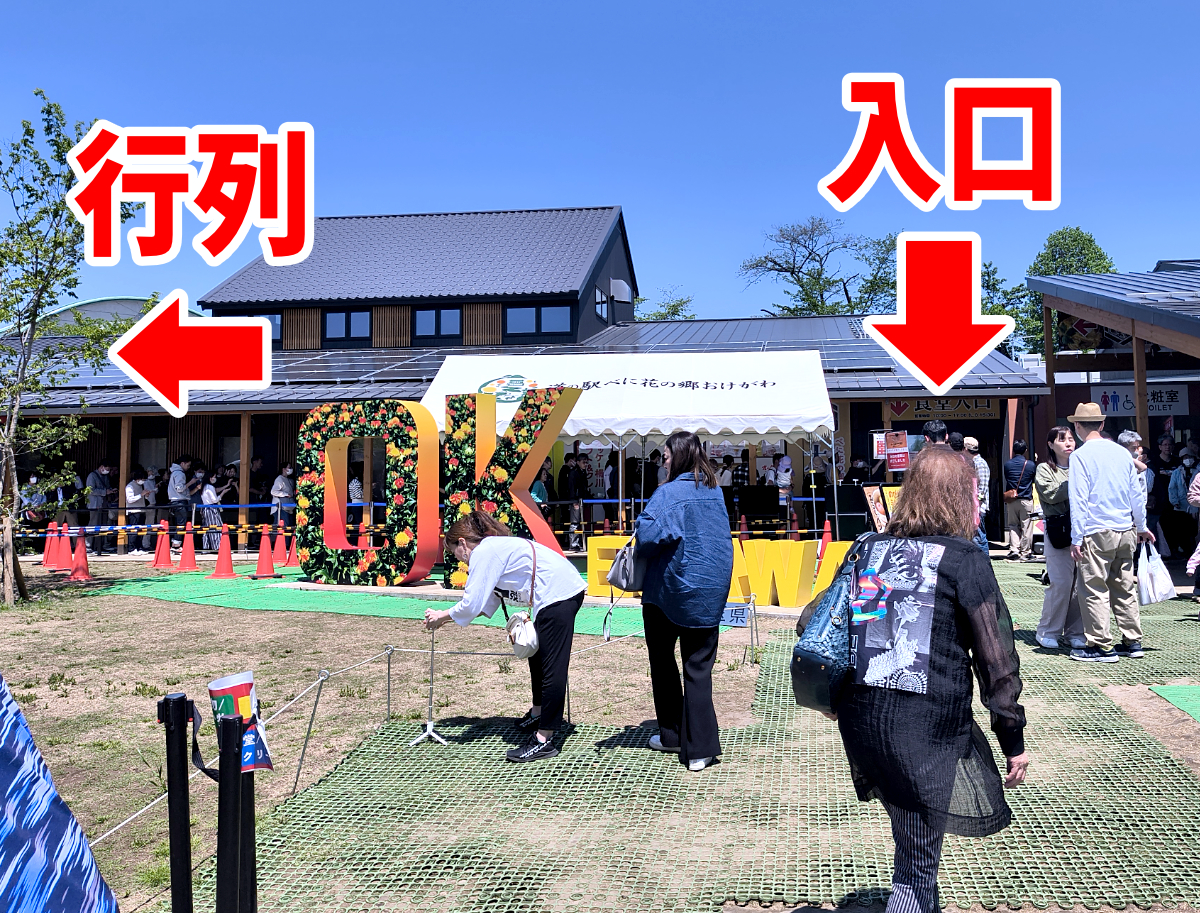 最初にお伝えしておきたい。GW中に行くなら車での訪問はおすすめしない。なぜなら、先にも述べたように混み過ぎて駐車出来ない可能性があるからだ。施設前は渋滞しており、目の前の交差点からその先まで車がず~っと並んでいた。