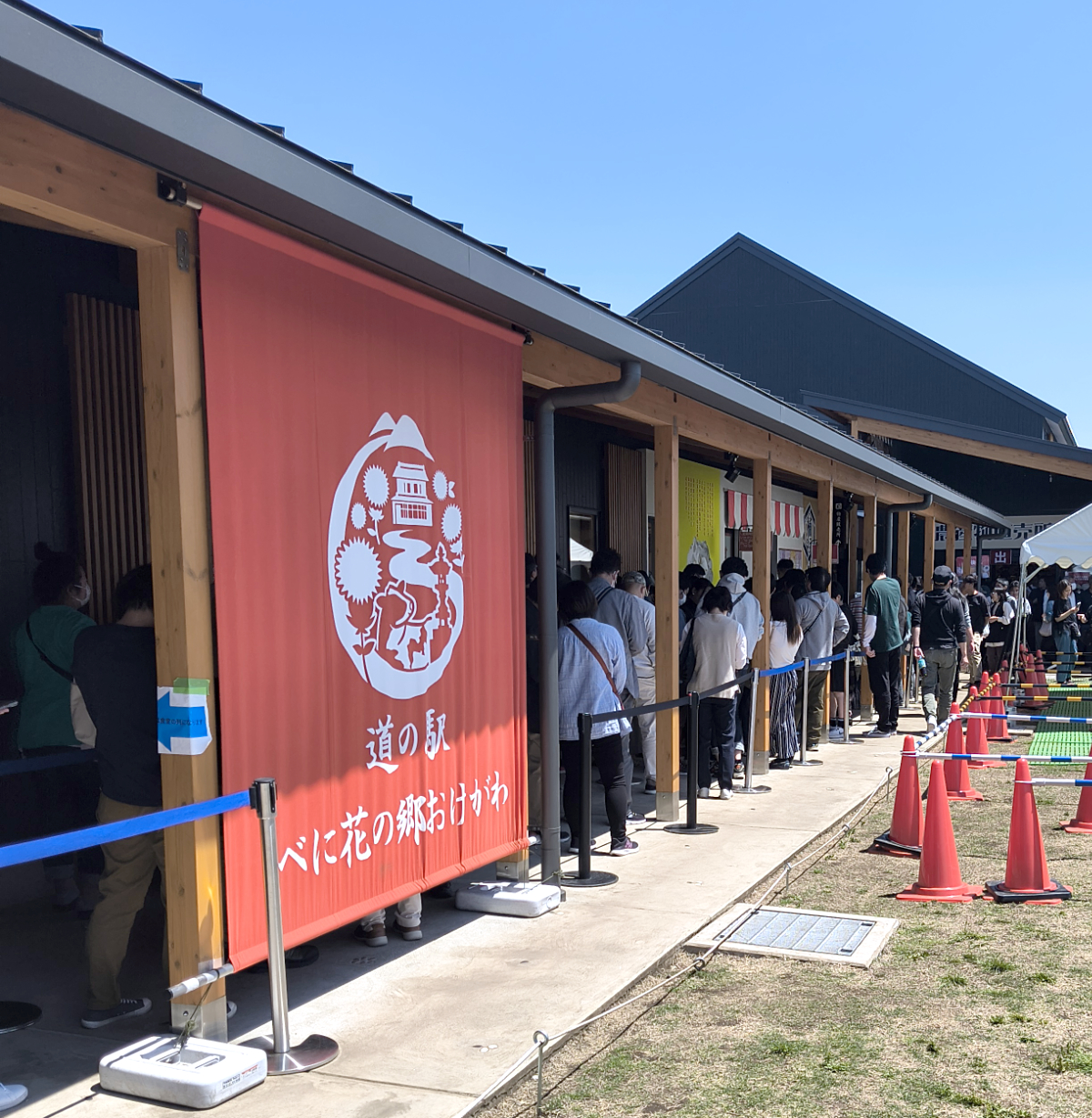 そこから徒歩約15分で道の駅に到着した。施設前には長い車の列が。GWの中日でもこの車列ということは、祝日はかなりヤバそう。
