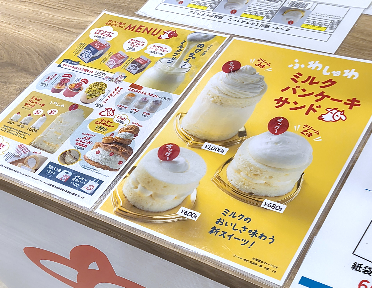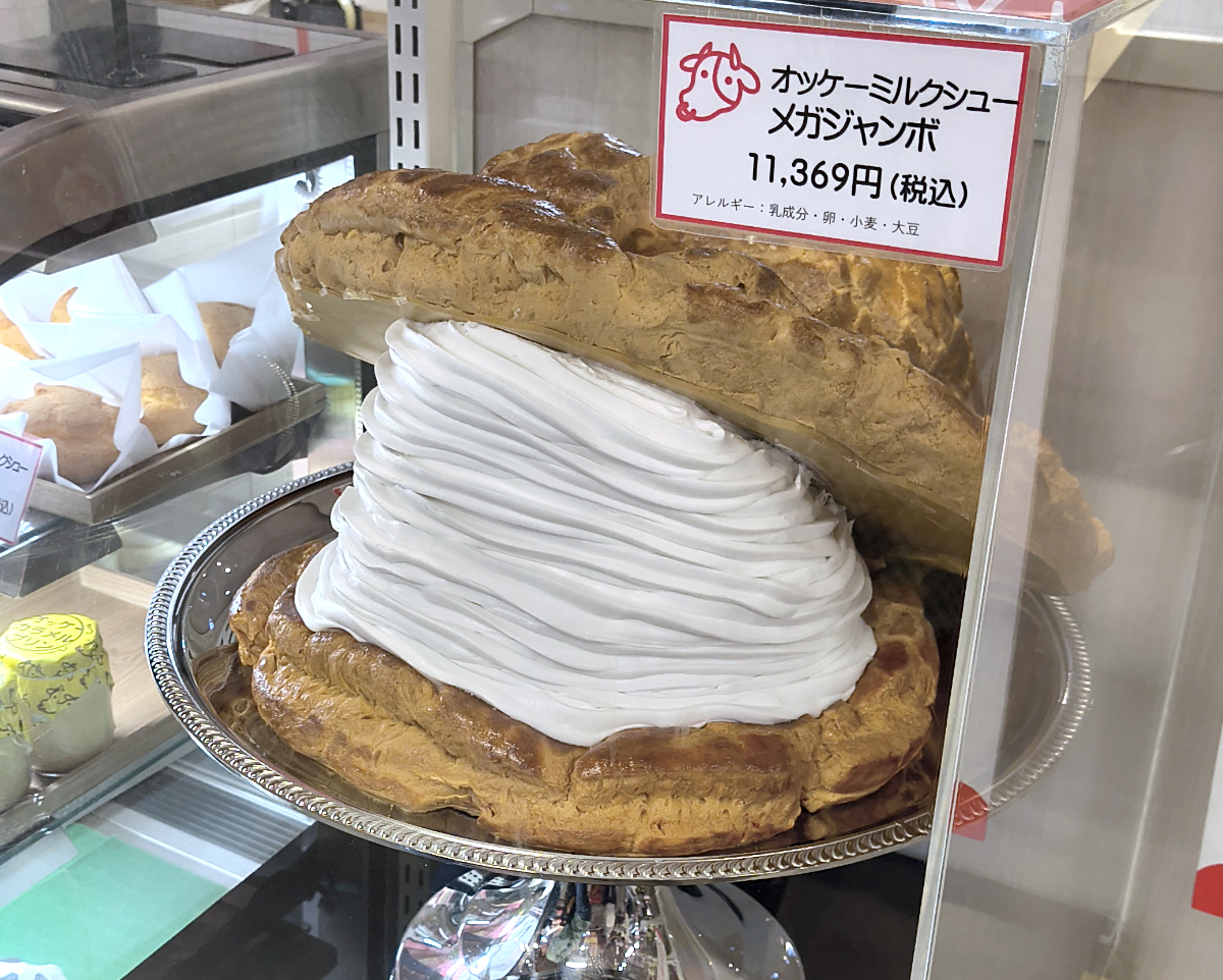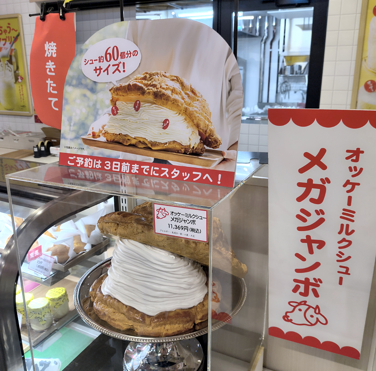 実はこの一角に「オッケー桶川 ミルク」というスイーツ販売コーナーがあった。しかも、こっちはそれほど並んでない! 店先には超巨大なシュークリーム! 何これ、クソデカい! メガジャンボですって。