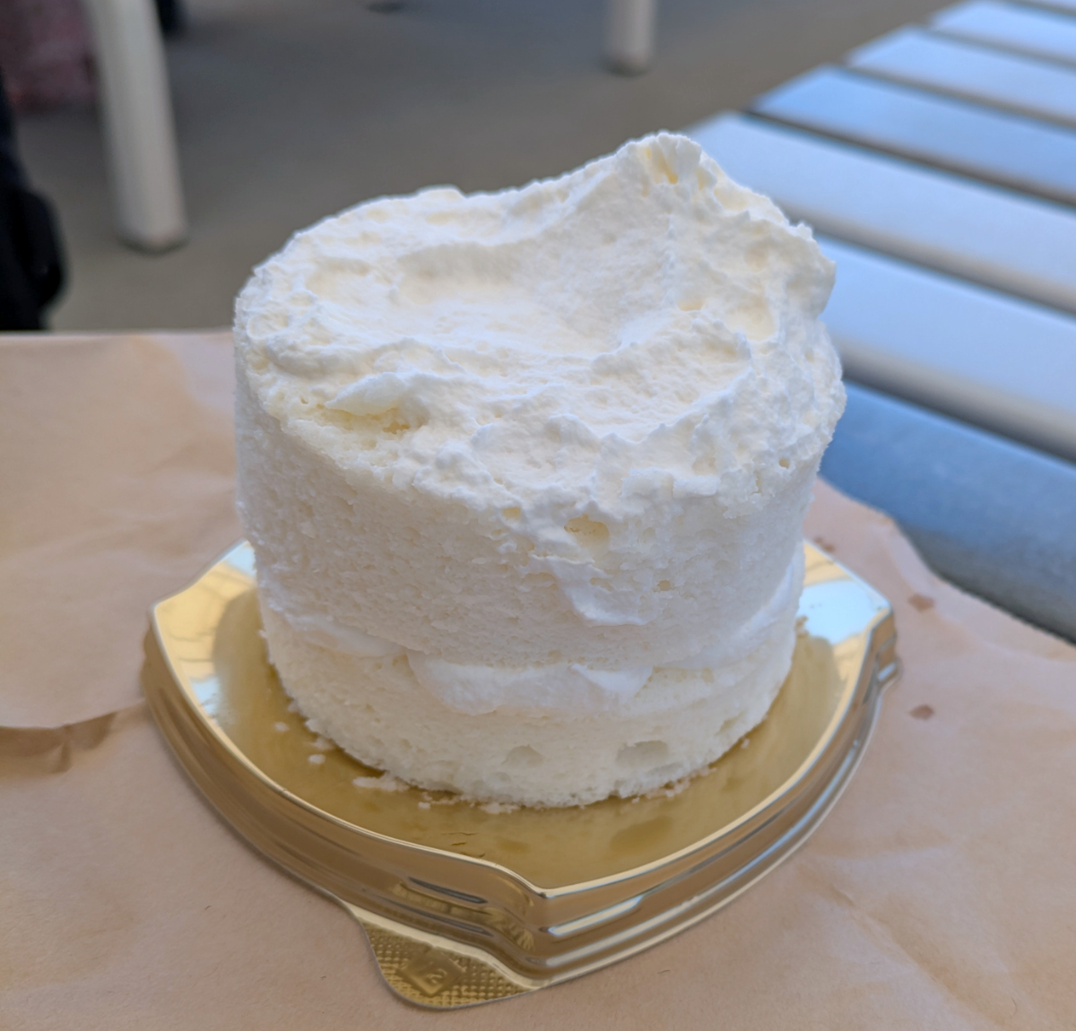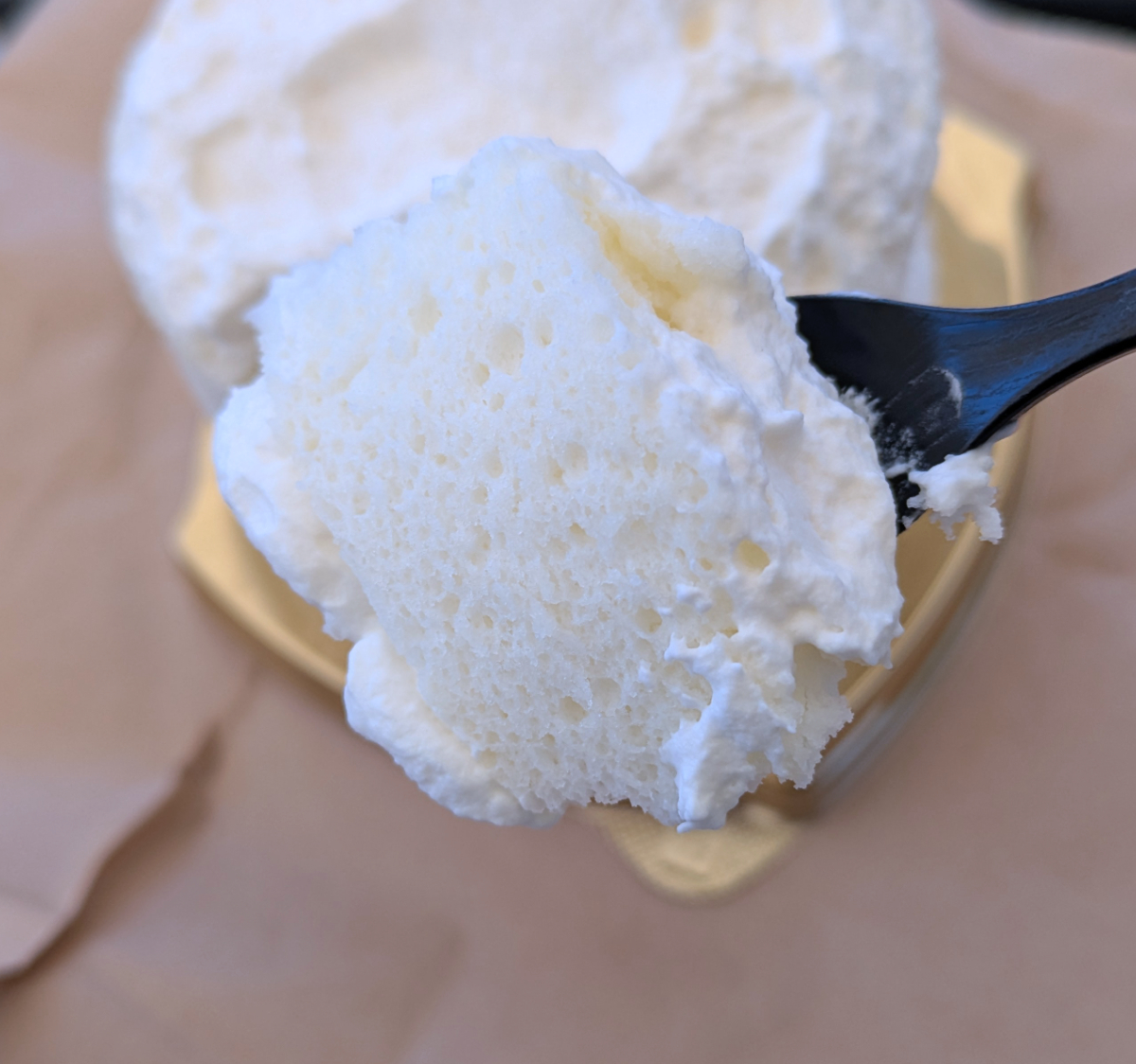 クリームは口当たりがとてもなめらか、大げさに表現すると「甘い空気」を舐めているような気分だ。こういうのを「エアリー(airy)」というのだろう。その気になったら飲めそうだ。