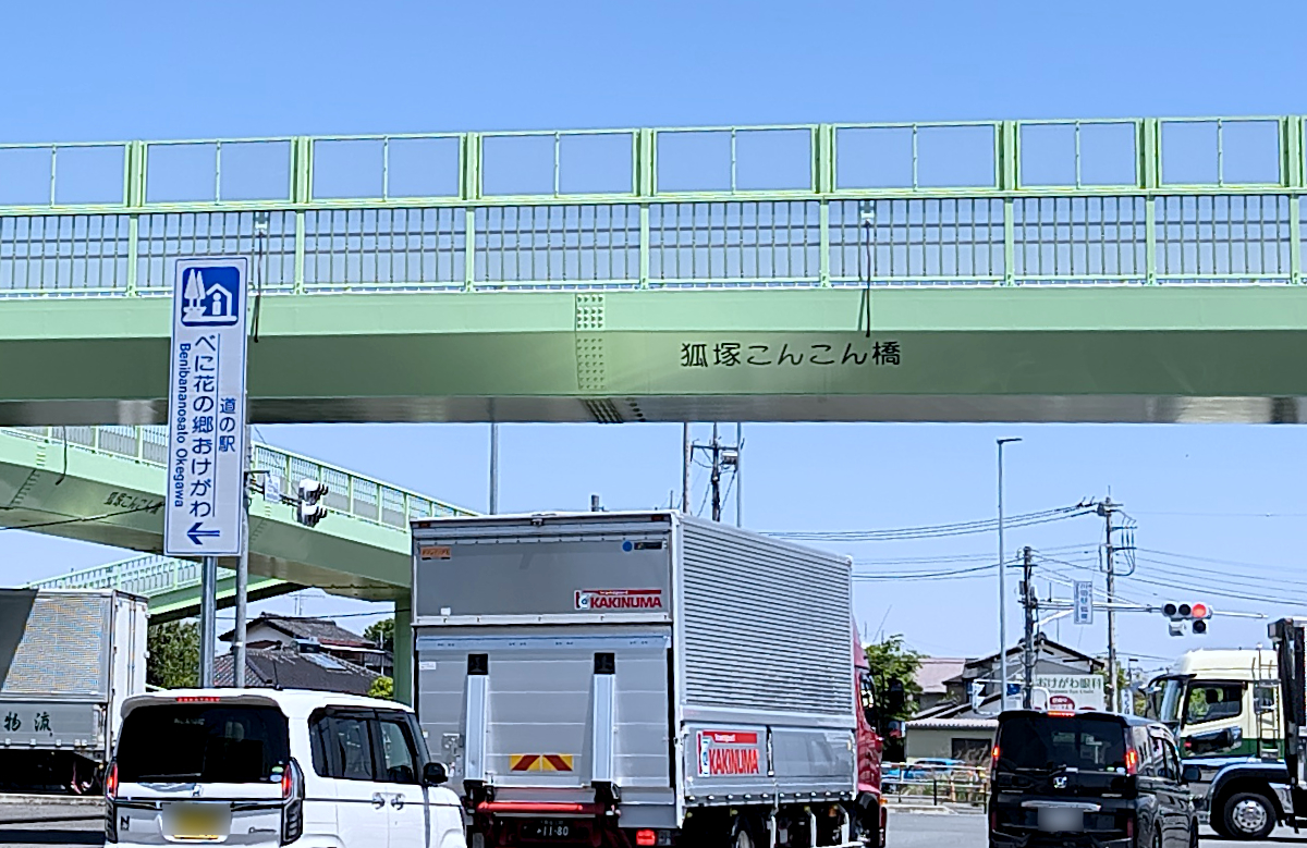 往路はタイミングよくバスに乗れたので、道の駅最寄の「川田谷支所」の停留所で下車。案内版のある交差点の陸橋は「狐塚こんこん橋」というそうだ。可愛い名前だね。