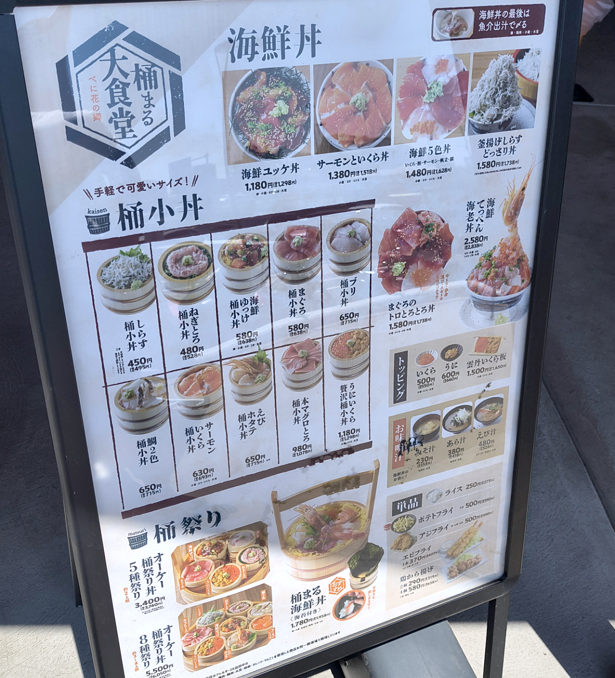 今、12時前なので、早いうちに食事を済ませた方が良さそうだな。「桶まる大食堂」に行ってみよう。席数が140もあるから、多分入れるとは思うんだけどな。メニューを見ると、海なし県なのに海鮮丼を推しているな。