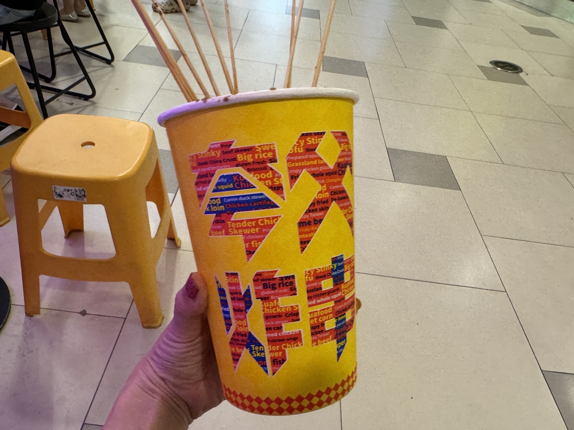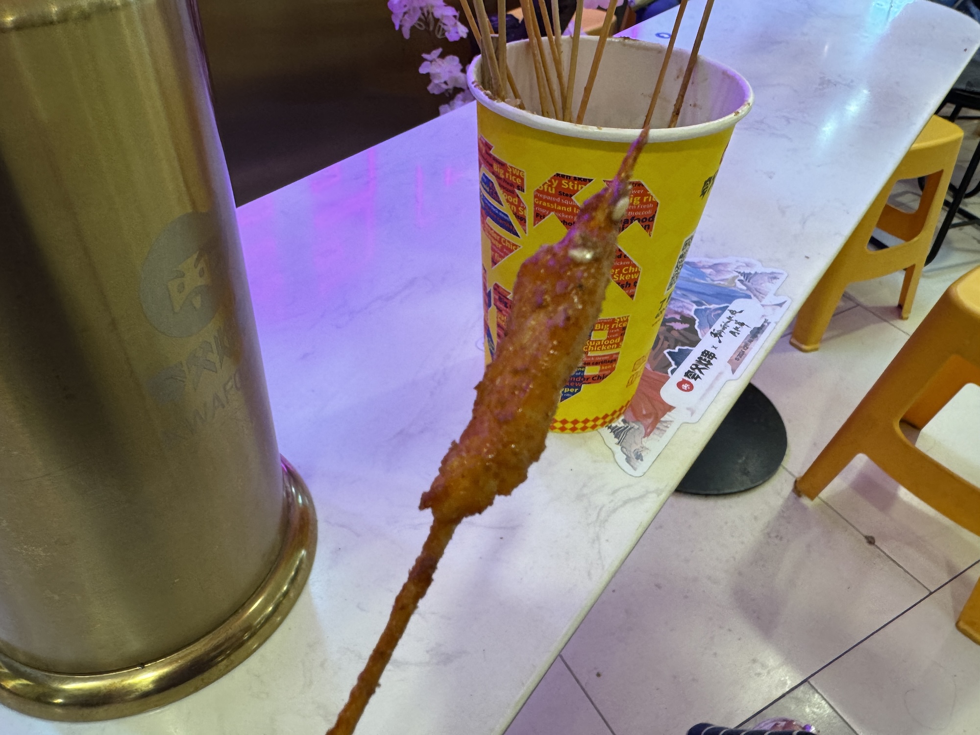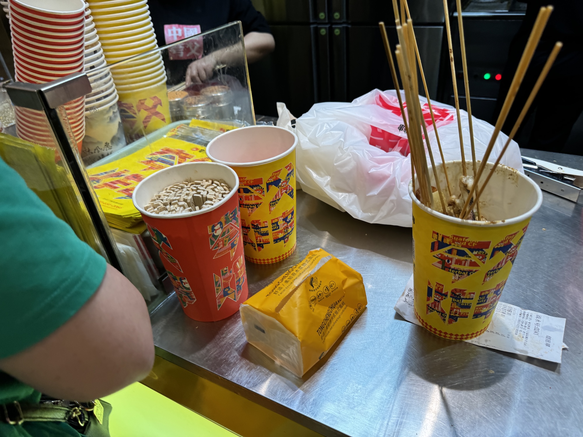 だんだん慣れてきたので、思い切って「小脇串抱え歩き食い」にもチャレンジしてみた。どう? 盛れてる? ナウい? 日本ではゴミ箱の少なさや公共マナーその他の問題からなかなか普及しづらいかもしれないが……中国へ来たらぜひ挑戦してみてほしい行事の1つである。アガるよ!!!