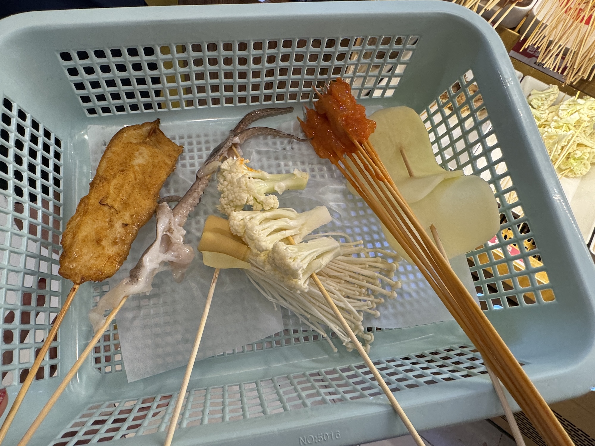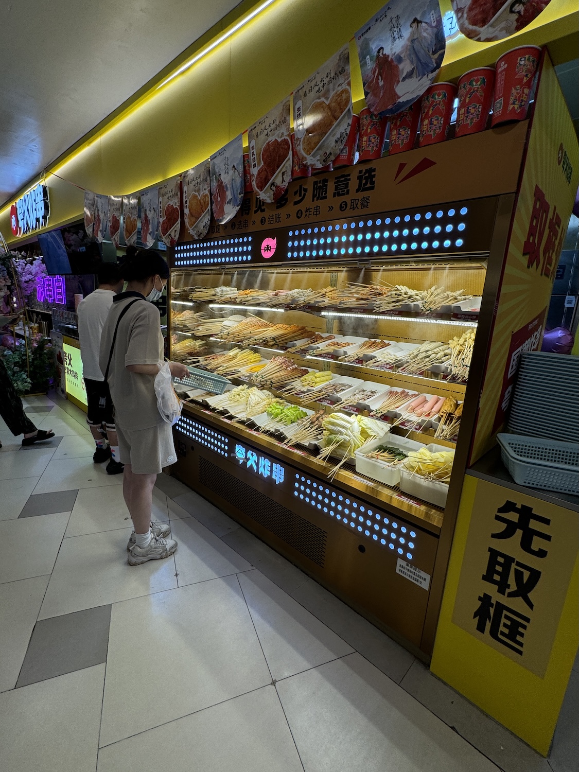 ショッピングモールの地下でひときわ光を放つその店は『夸父炸串』というチェーン店。ケースに並んだ多彩な串刺しの中から好きなものを選び、その場で調理してもらうという日本には無いスタイルのお店だ。