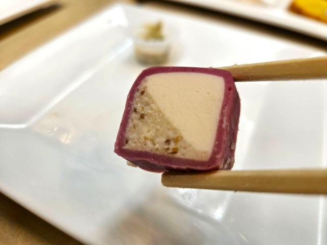 食べてビックリ。クリームチーズ&イチジクの甘い味がする。かまぼこの風味も感じる。でも、すべてが完璧に調和している。こんな攻め方もできるのかよ……すごっ。