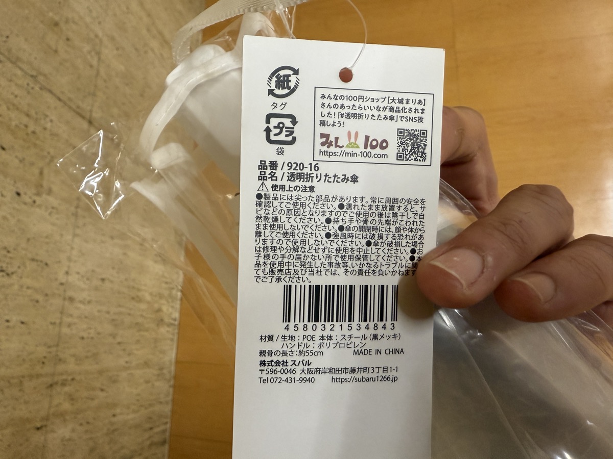 購入したのは第4の100円ショップこと「ワッツ(Watts)」だ。価格は税込660円で、「透明折り畳み傘」が正式名称らしい。サイズは55cmの8本骨。ええやん。