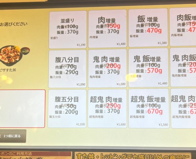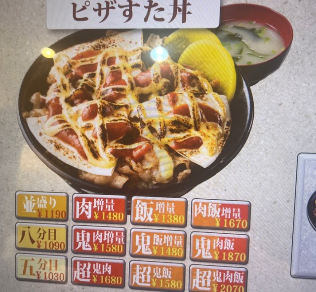 今回販売されている『ピザすた丼』には、「腹5分目」から「超鬼肉飯増量」までの12種類から選べるサイズがある。そして私(耕平)には、伝説のすた丼屋の新メニューを食レポする時の流儀がある。それは最大サイズ「超鬼肉飯増量」で食べること。