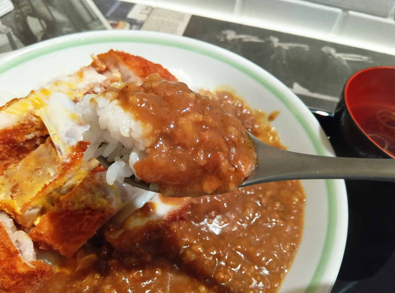そして、質の良さはとんかつからも感じられた。揚げたてのとんかつをサクッと食べる度に肉がジューシーさを放つ。そんなカレーとかつ丼を合わせて食べると、口の中は色んな豚の楽しみが合体した豚祭に。