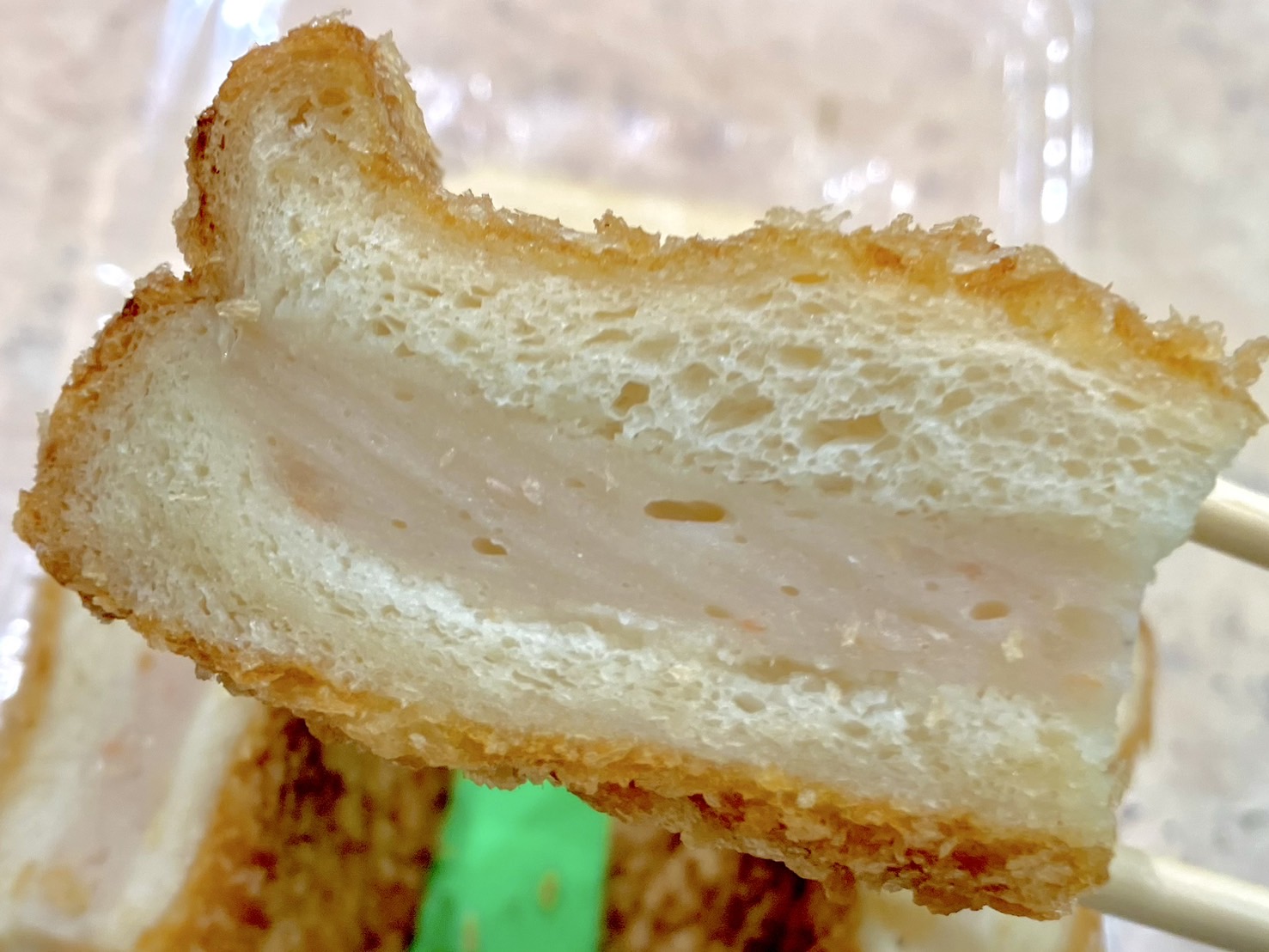 お店の近くにあったイートインコーナーでパッケージを開封してみると、中には淡いピンク色の何かが挟まれた揚げ物が入っていた。