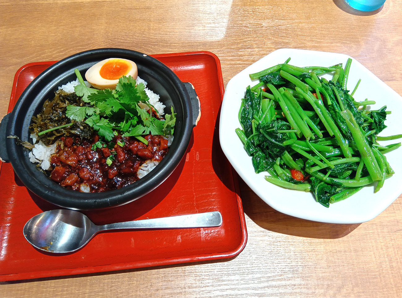 そこで「ルーローファン(税込670円)」と「空心菜(クウシンサイ)炒め(税込830円)」を注文。1人用鍋で出てくるルーローファン。肉あんかけだけでなく、パクチーと煮卵の卵黄の色が映えていて、鍋に入ることでより彩りの豊かさが際立っている。