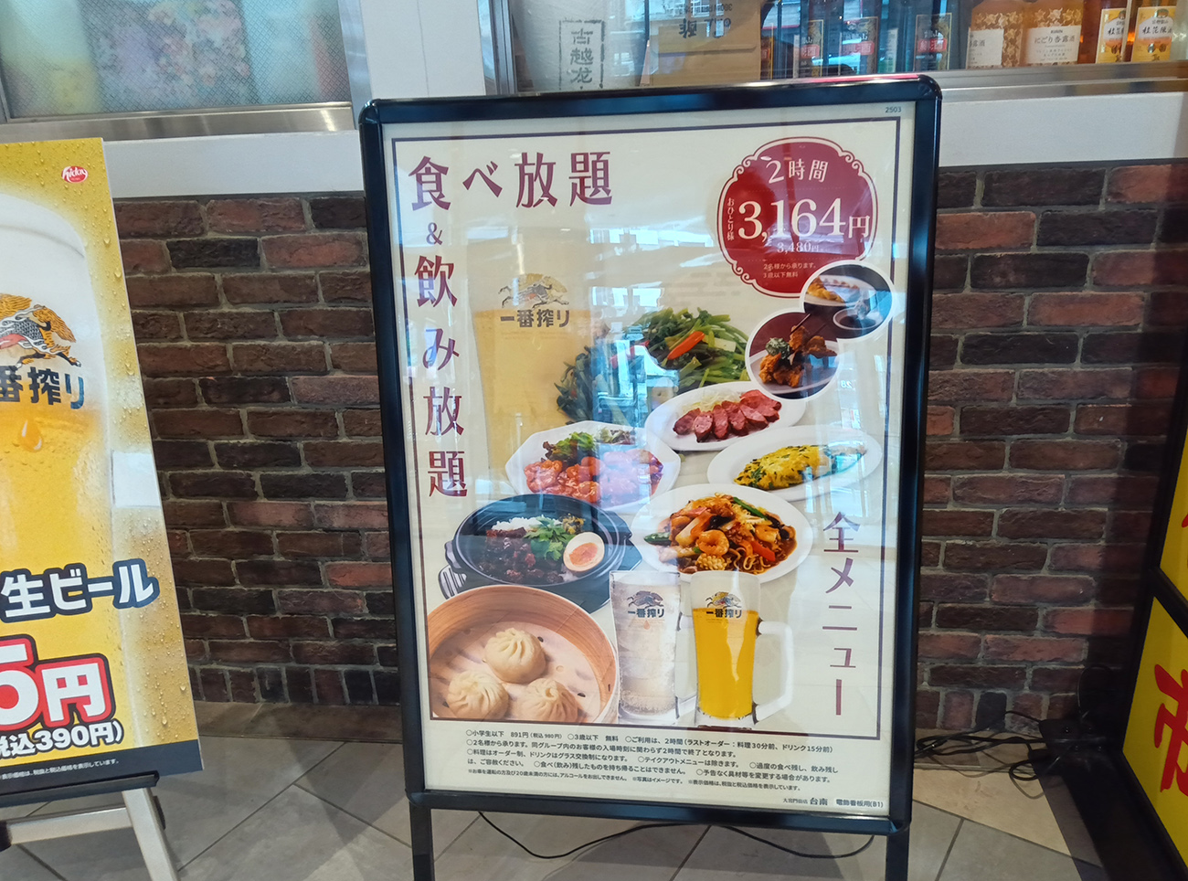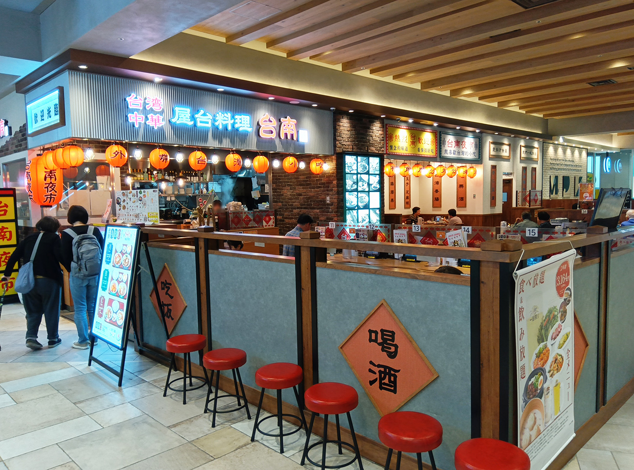 『台南』は壁がなくフードコート的な店のデザインに屋台のオープンさが感じられる。店外に向けられた看板でメニューを確認したところ、単品注文以外に食べ飲み放題(2時間3164円)というプランもあるようだ。日高屋系列で食べ飲み放題はなかなか熱い。熱烈中華食堂だけに。
