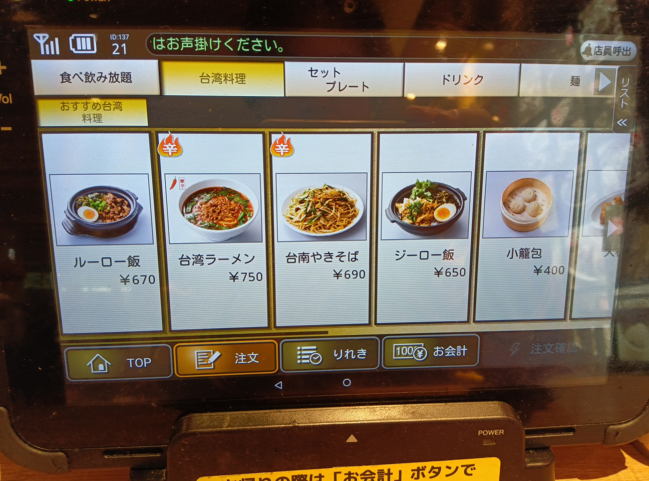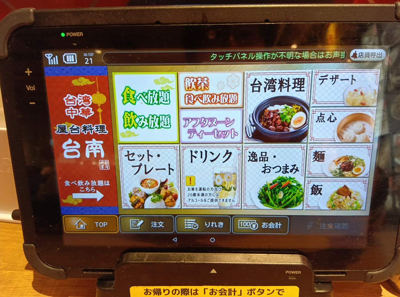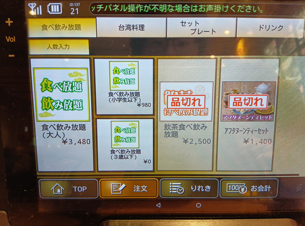 店員さん「飲茶食べ放題は終了しまして、タッチパネル上はまだ更新されてないため、品切れ表記になってます」