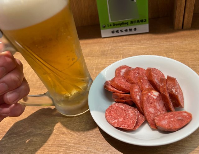 ▼夜限定晩酌セットでは餃子以外にもう1皿付いてくる。キュウリや豚耳、ソーセージなどから選択可能で、今回はソーセージをチョイス。日本でメジャーなソーセージと比べて、“肉食ってる感” が強い印象。お酒には合う