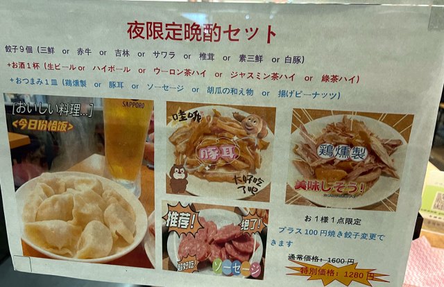 つい先日、高田馬場あたりを歩いているときに「夜限定晩酌セット」と書かれた貼り紙を見つけた。なんでも、餃子9個にアルコール1杯、おつまみ1皿が付いて1280円だという。