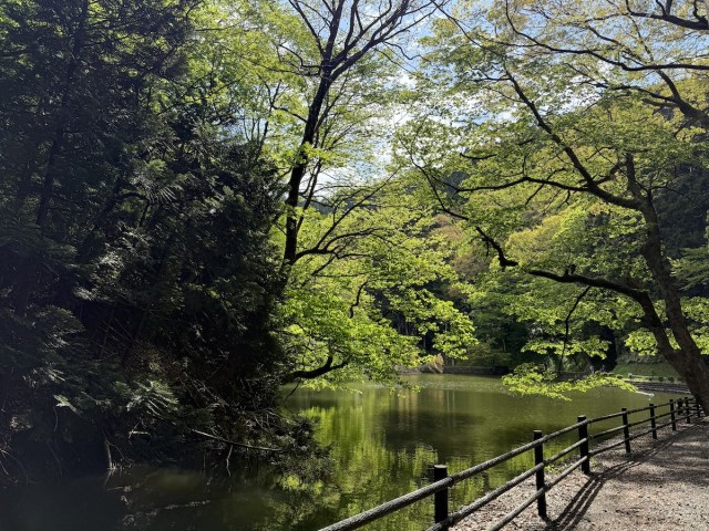 すぐにパッと開けた場所に出た。未確認生物が潜んでいると言われても納得してしまいそうな大きな池が広がる。龍神伝説の残るこの池は、地底で海と通じていると言われ、龍が貝を食べる=貝喰池(かいばみのいけ)と呼ぶのだそう。