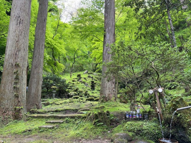 さらに奥には、水を汲める清流があった。使い古された表現で恥ずかしいが、「まるでジブリの世界」と言いたくなるような幻想的な場所だ。新緑が目にまぶしく、まさに聖域。