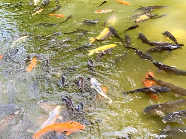 もちろん人面魚は展示などされているわけではなく、自由意志で池を泳いでいる。黄色は目立つから、すぐにわかると思うんだけど……