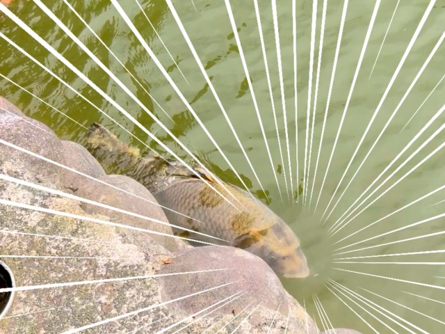 そこで見たのは、こちらに泳いでくる1匹の茶色っぽい鯉だ。記憶にある金色の鯉とは少し違うが……