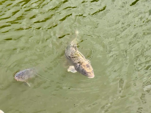 観察すること30分。鯉のエサを販売しているらしく、時折まいている人がいる。そっと近寄り、便乗して水面を観察する。しかし人面魚は一向に現れない。エサを購入した人にタダ乗りしている筆者を見抜いているのだろうか。
